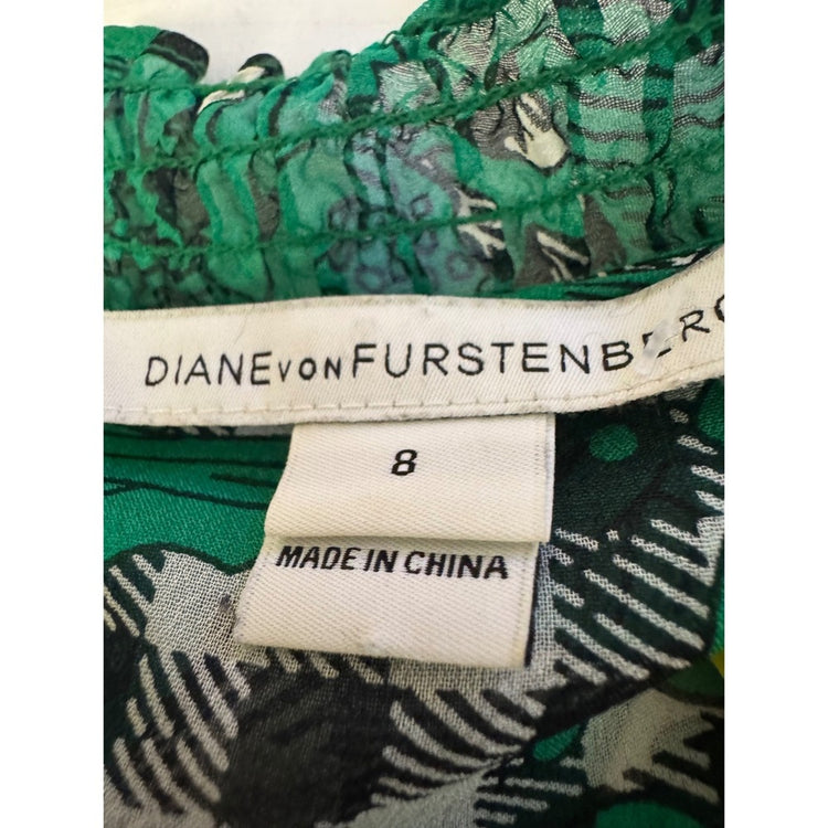 Diane von Furstenberg DVF Green Floral Print Smocked Neck Dress Size 8