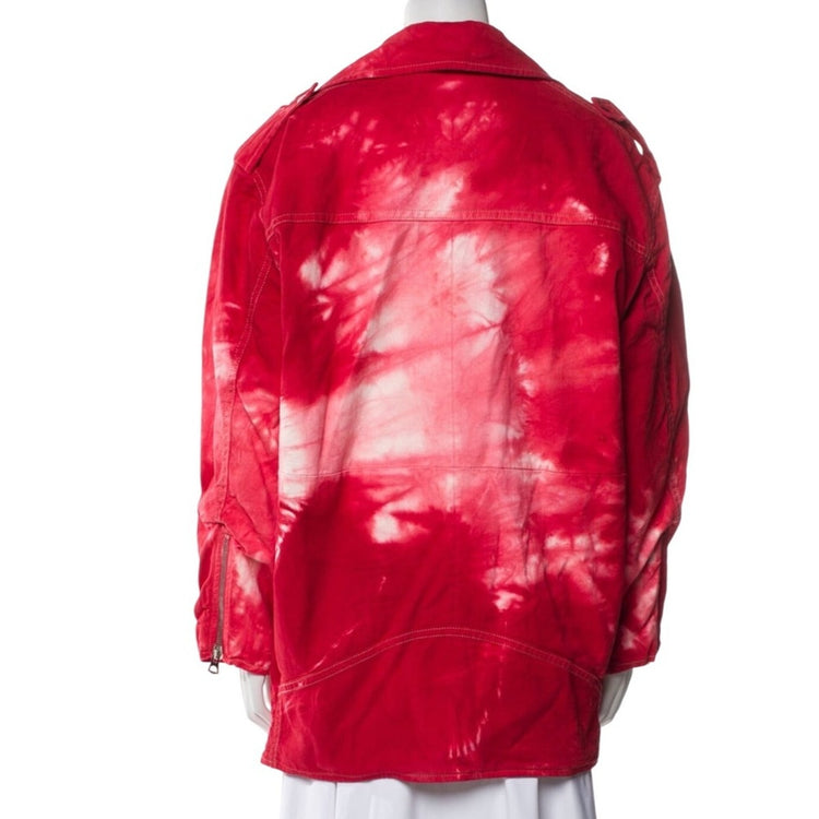 Striking oversized moto-style coat by Isabel Marant Étoile, crafted in a bold red-and-white tie-dye finish. Features asymmetrical front zip, silver-tone hardware, epaulette details, and a slouchy relaxed fit that channels Marant's signature off-duty Parisian vibe.