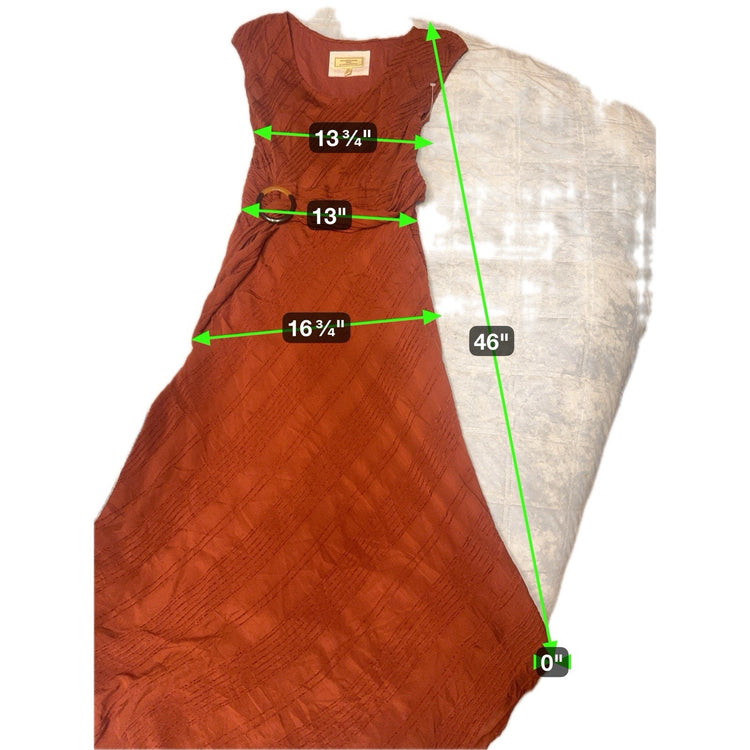 Elegant and effortlessly flattering, this Anthropologie Moulinette Soeurs belted maxi dress features a rich rust-red hue with subtle diagonal textured striping. Designed with a scoop neckline, cap sleeves, and a removable waist belt with tortoise buckle, it creates a timeless bohemian silhouette.
