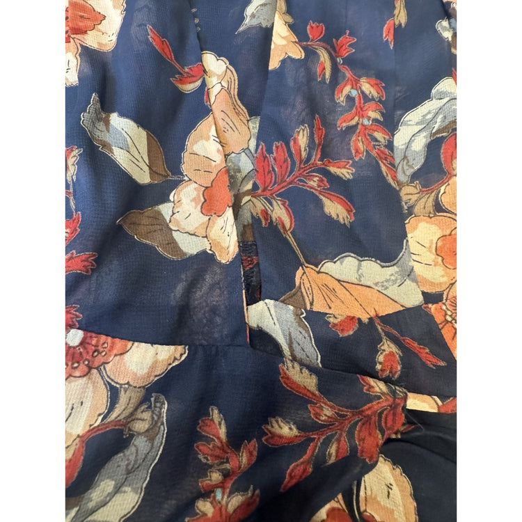 Reformation women’s mini dress in size Small. Navy base with orange, cream, and red floral print. Short sleeve wrap style with v-neckline and tie closure. Flowy lightweight fabric.