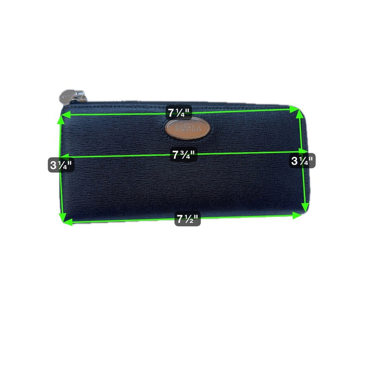 Keywords: Furla wallet, black leather wallet, women's wallet, continental wallet, zip around wallet, designer wallet, luxury wallet, textured leather, coin purse, card holder, fashion accessory, elegant wallet, classic wallet, Furla purse, structured wallet