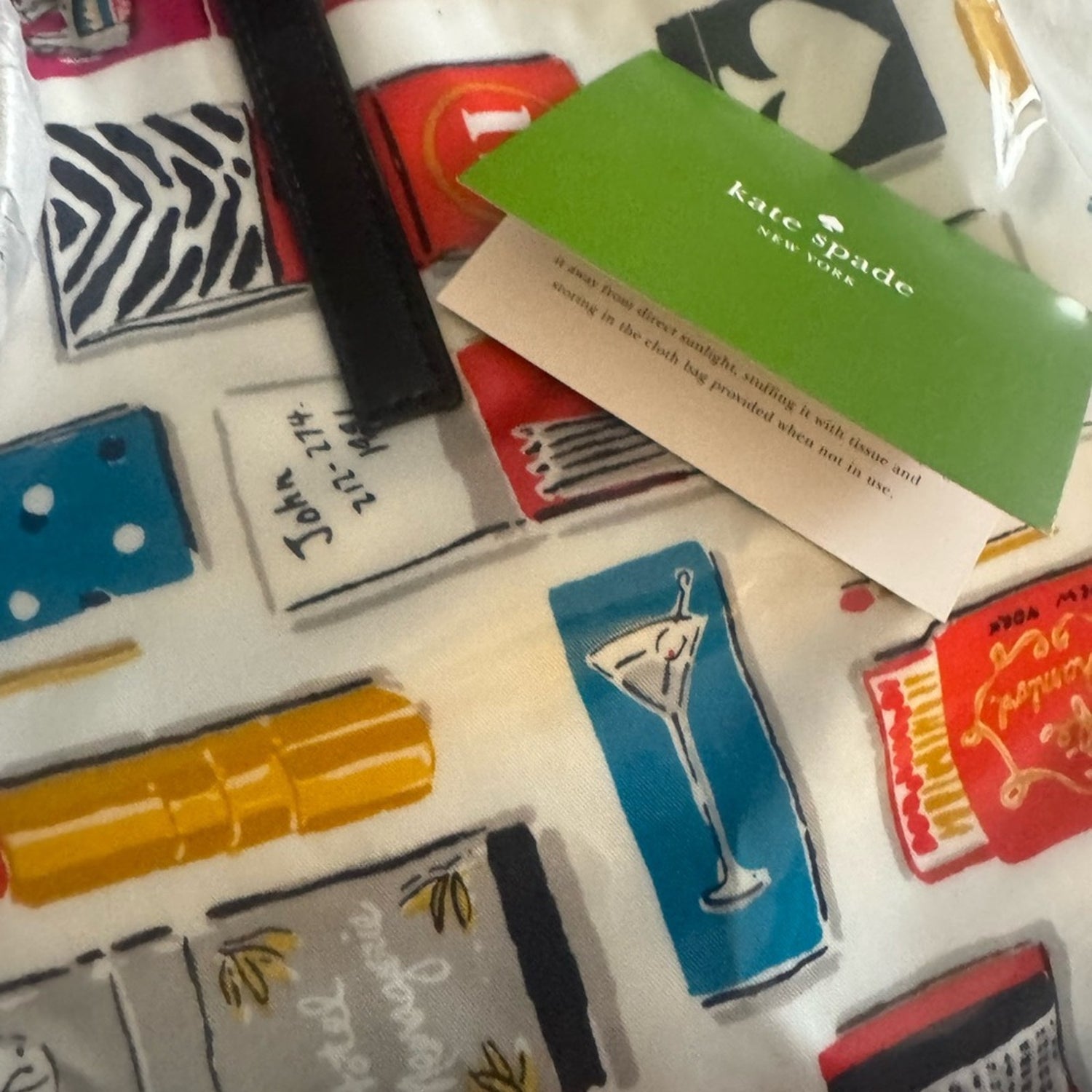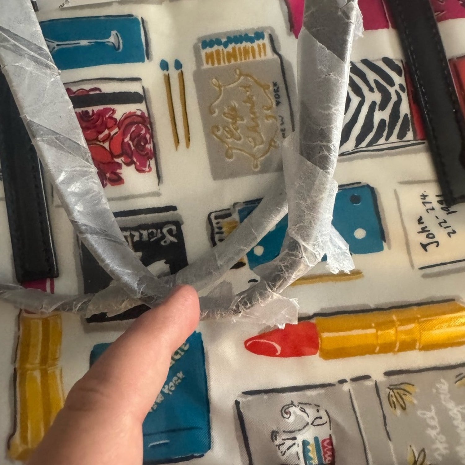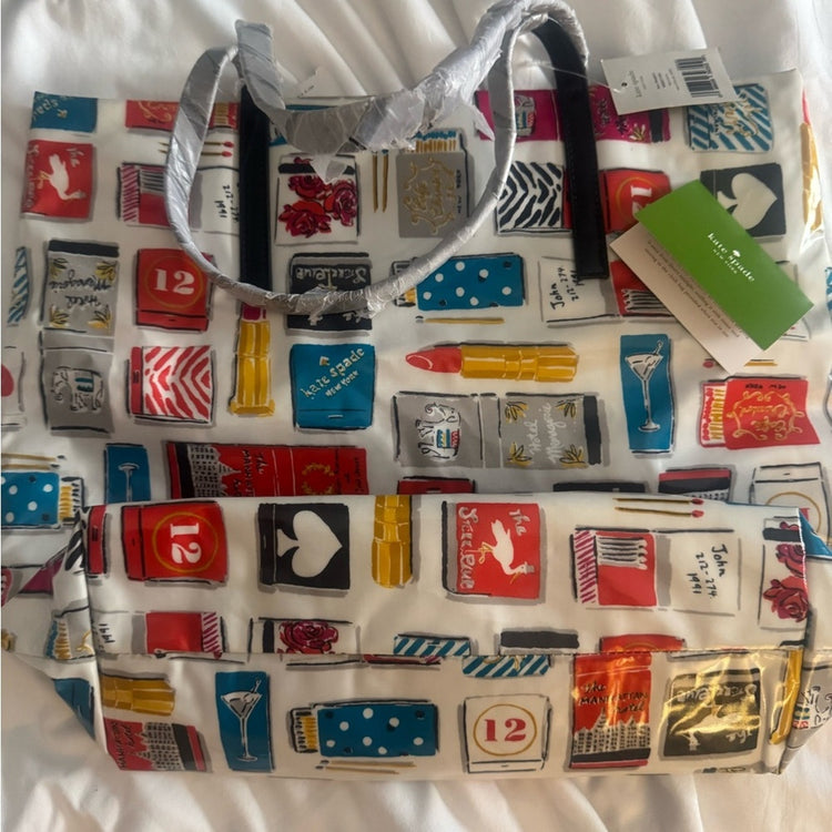 This Kate Spade tote bag showcases a vibrant retro-style print in red and blue, perfect for adding a playful touch to your ensemble. Crafted from sturdy canvas, it features a nostalgic postage stamp-like design that is both functional and decorative. Ideal for everyday use, this tote combines style and practicality effortlessly.