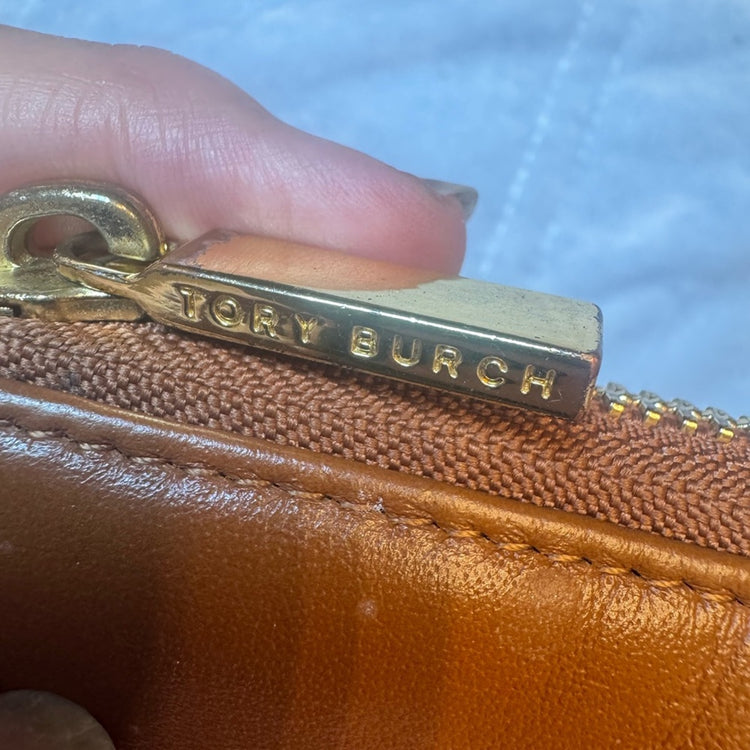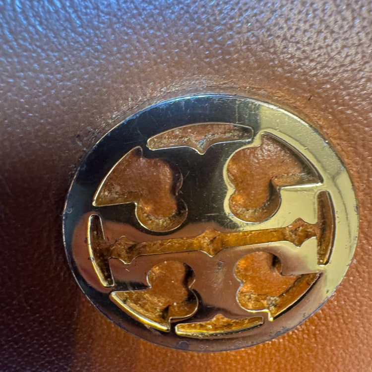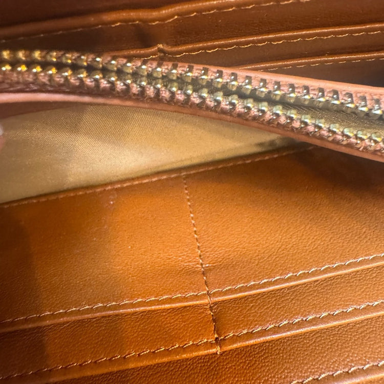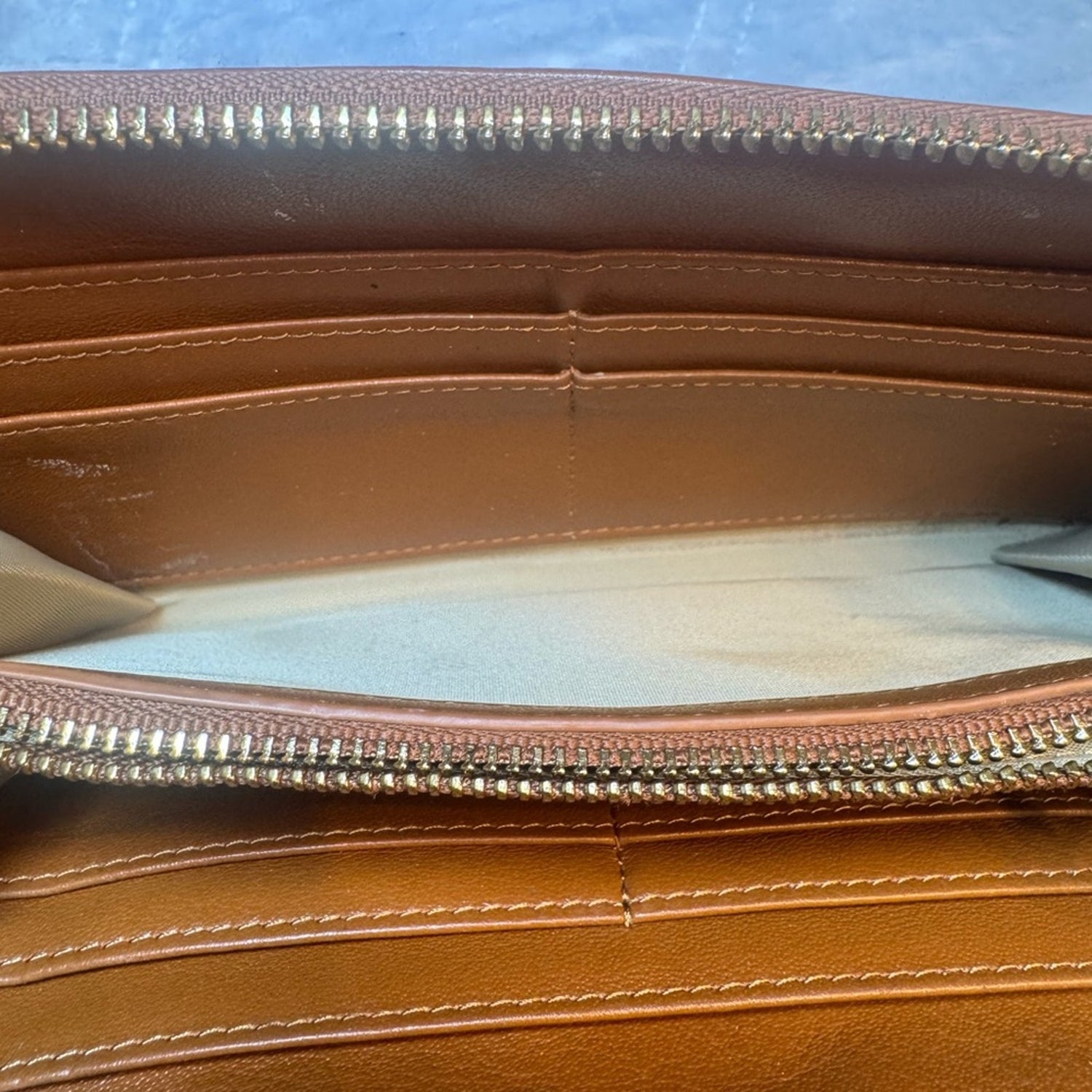 Elegant brown wallet. Features gold logo emblem. Sleek and stylish design.