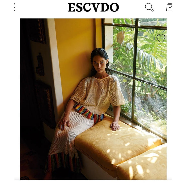 Artisanal and eye-catching ESCVDO crochet top featuring open-knit cream cotton with a bold rainbow fringe hem. Hand-crafted in Peru, this piece embodies the brand's commitment to heritage craftsmanship and modern design. Perfect styled over a cami or bralette for a chic festival, vacation, or summer layering look.