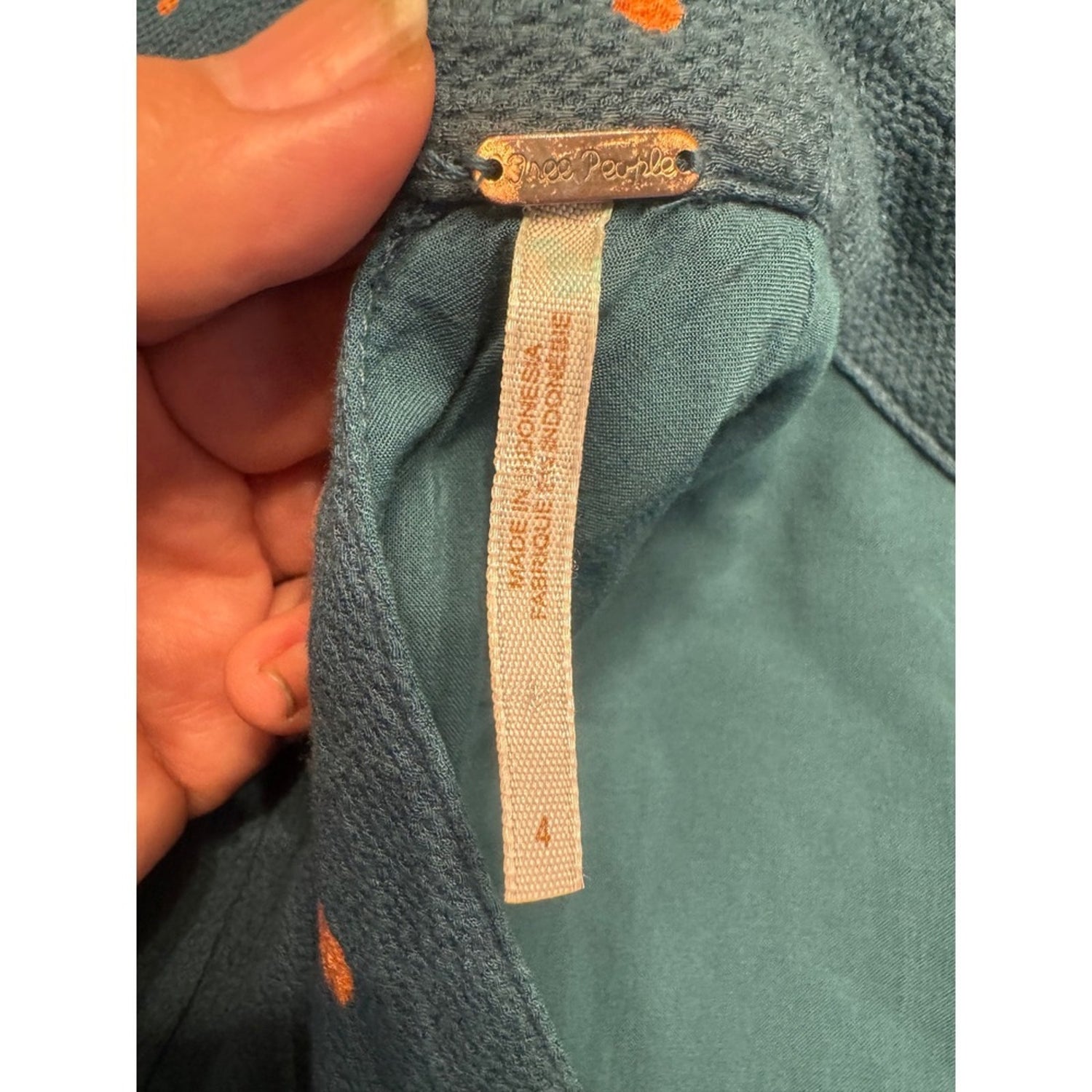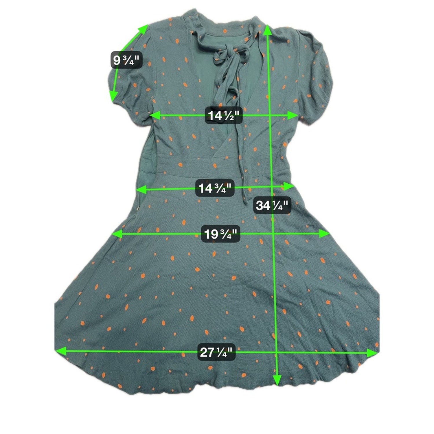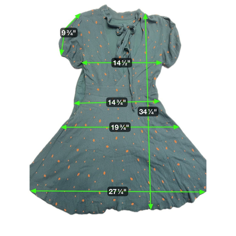 Keywords: Free People dress, womens dress, size 4, short sleeve dress, tie neck dress, green dress, orange polka dot, aline dress, mini dress, casual dress, boho dress, summer dress, spring dress
