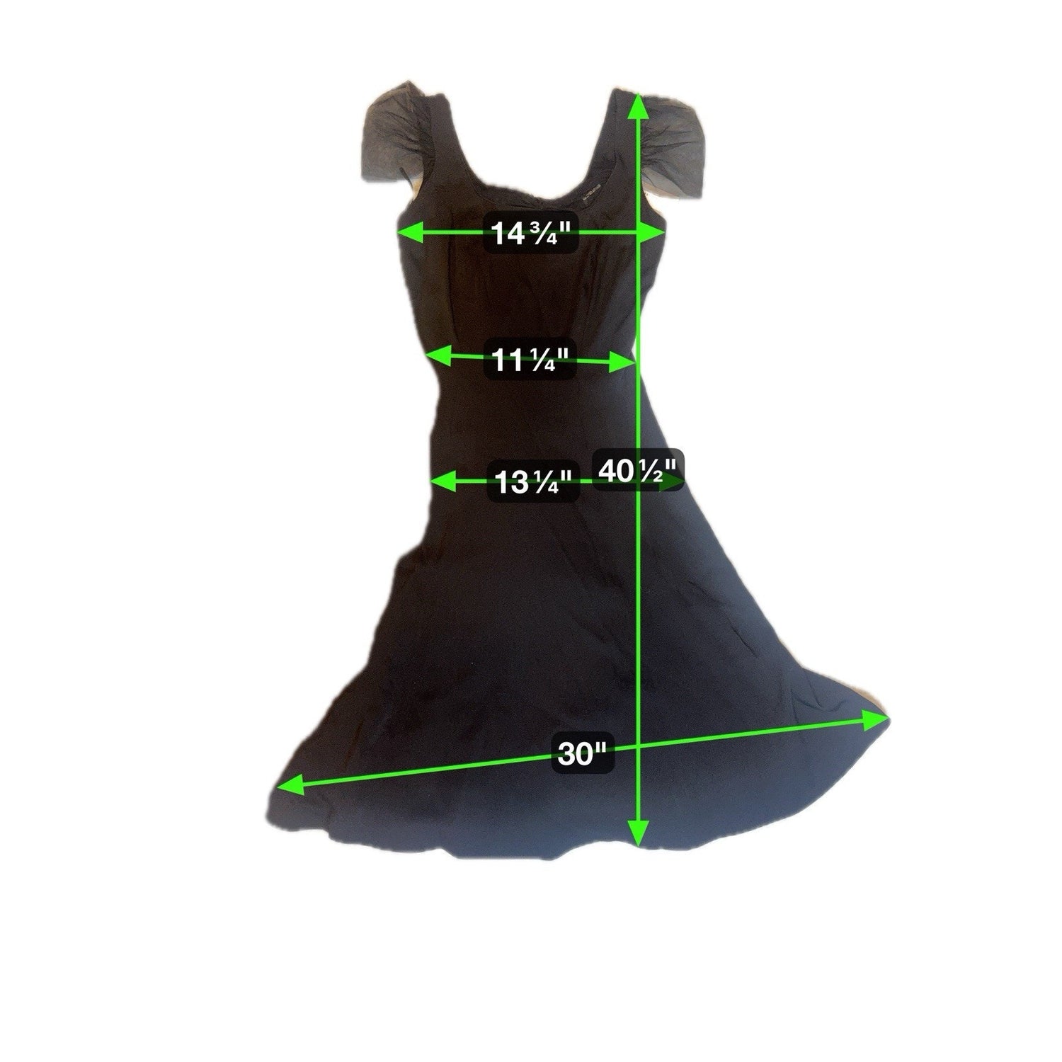 Elegant Giorgio Armani black dress with sheer short puff sleeves and a flattering fitted bodice that flows into a flared hem. A timeless little black dress silhouette, crafted in Italy with Armani’s signature minimalist tailoring.