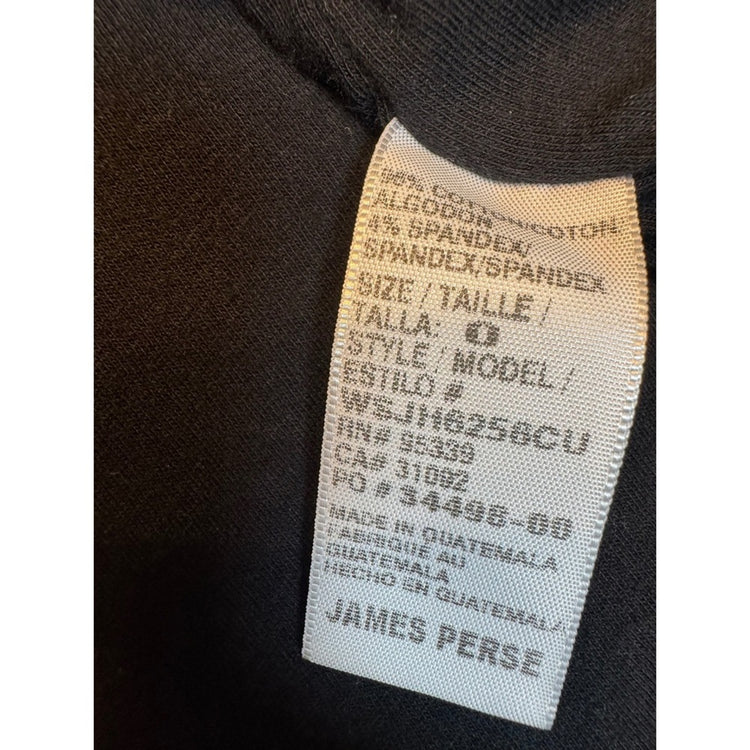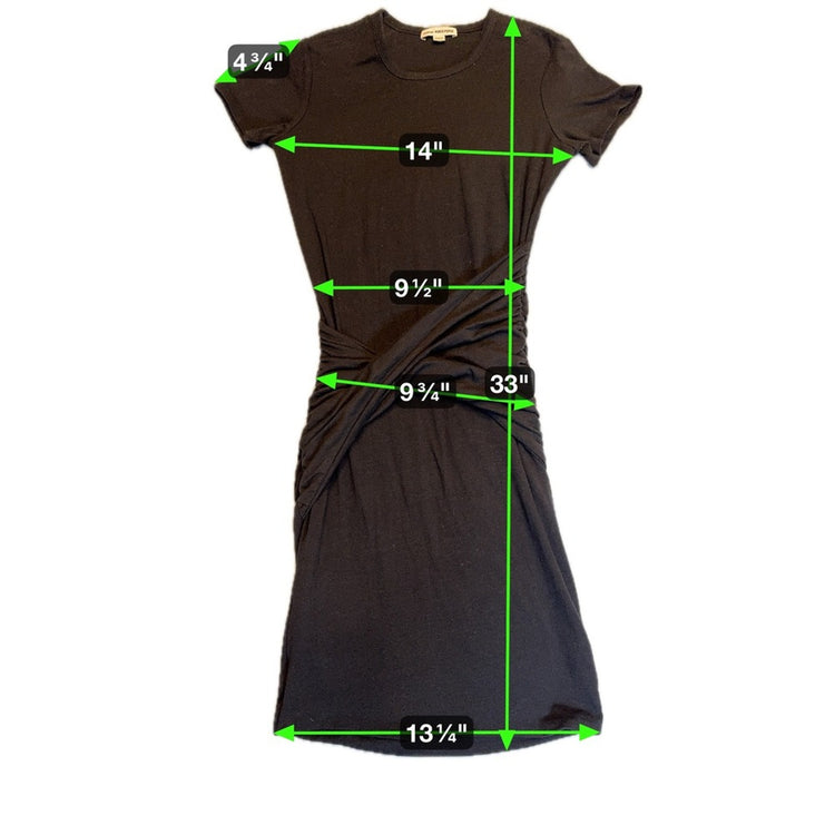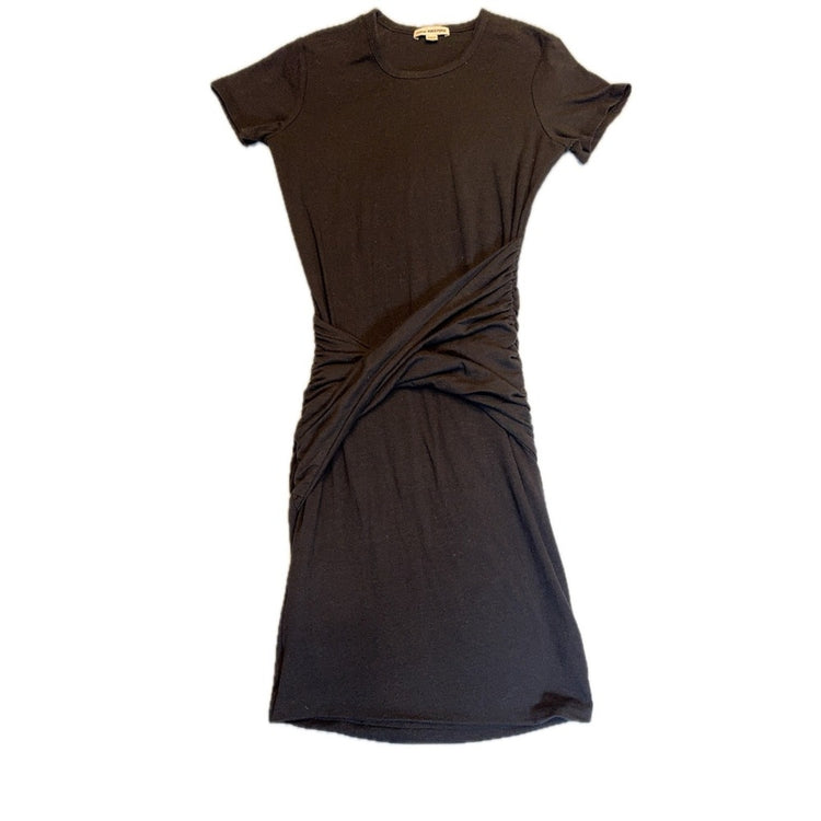 Keywords: James Perse, black dress, ruched dress, twisted dress, t-shirt dress, midi dress, knit dress, womens dress, designer dress, size 0, casual dress, short sleeve dress, round neck dress, little black dress