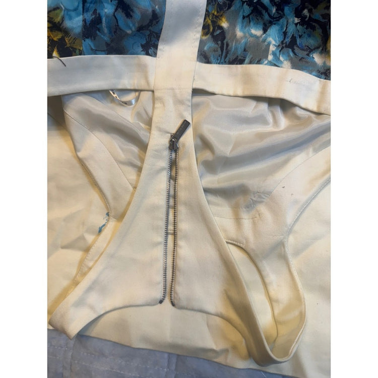 Stunning Karen Millen cocktail dress with painterly blue & gold floral print. Features halter neckline with open back cutout detail, fitted waist, and full lining for a polished finish. Perfect for weddings, garden parties, or summer soirées.