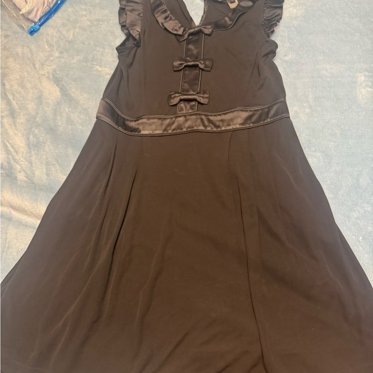 Elegant black midi dress with charming bow details. Features ruffled sleeves and a flattering fit. Perfect for any occasion.