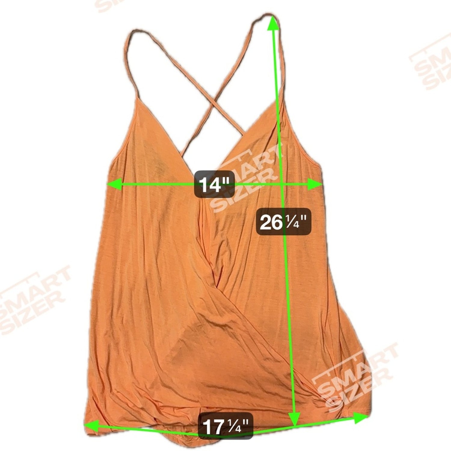Stylish orange tank top. Features a wrap design. Spaghetti straps with criss-cross back.