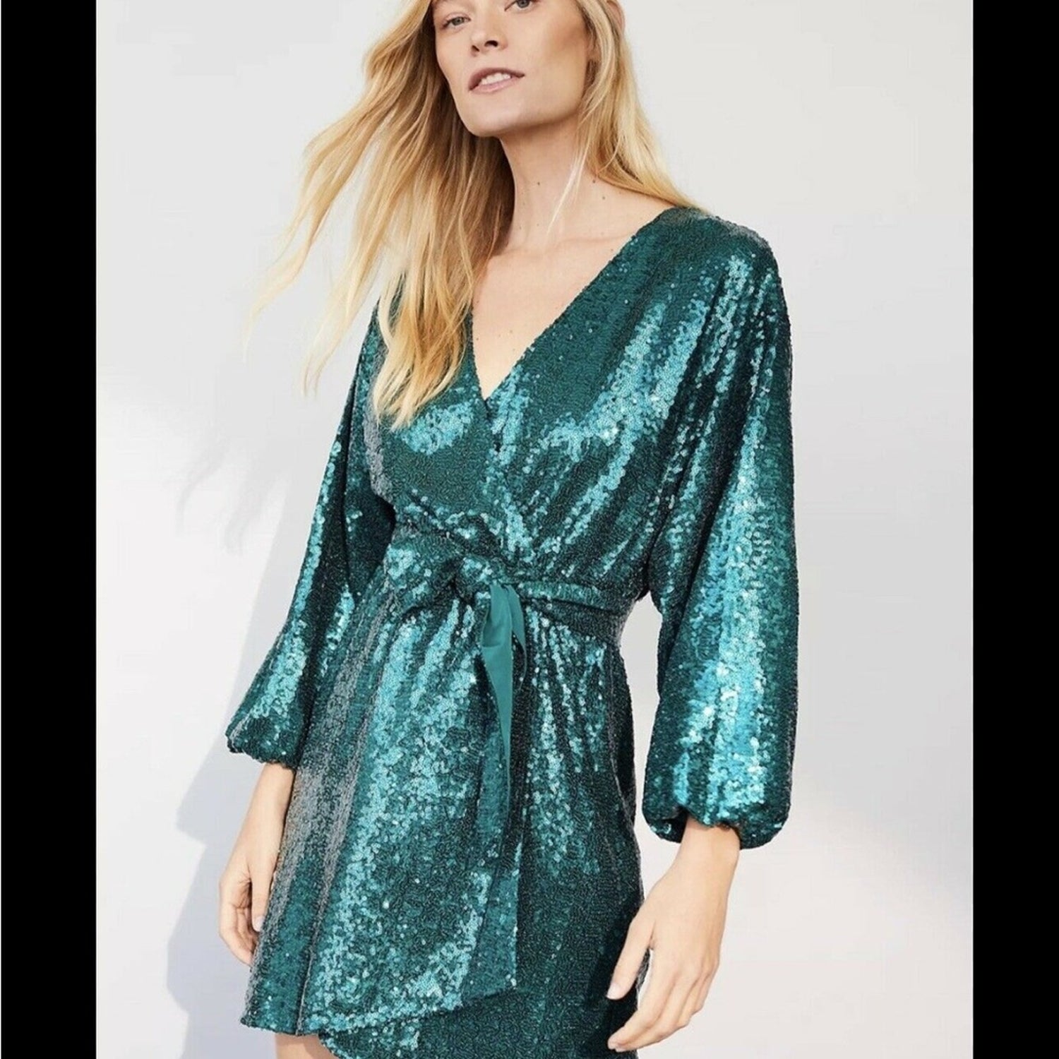 This elegant Anthropologie dress showcases a vibrant green color and sophisticated long sleeves, making it a versatile choice for any occasion. Crafted with meticulous attention to detail, it offers a flattering silhouette and timeless appeal.