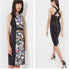 Ted Baker London Akva Kensington Floral Body-Con Dress in Multi, size 4 US (Ted Baker size 1). Features a bold floral print front panel with black side panels for a flattering silhouette. Sleeveless bodycon style with exposed back zip closure. Timeless and elegant statement piece perfect for weddings, cocktail parties, or special occasions.