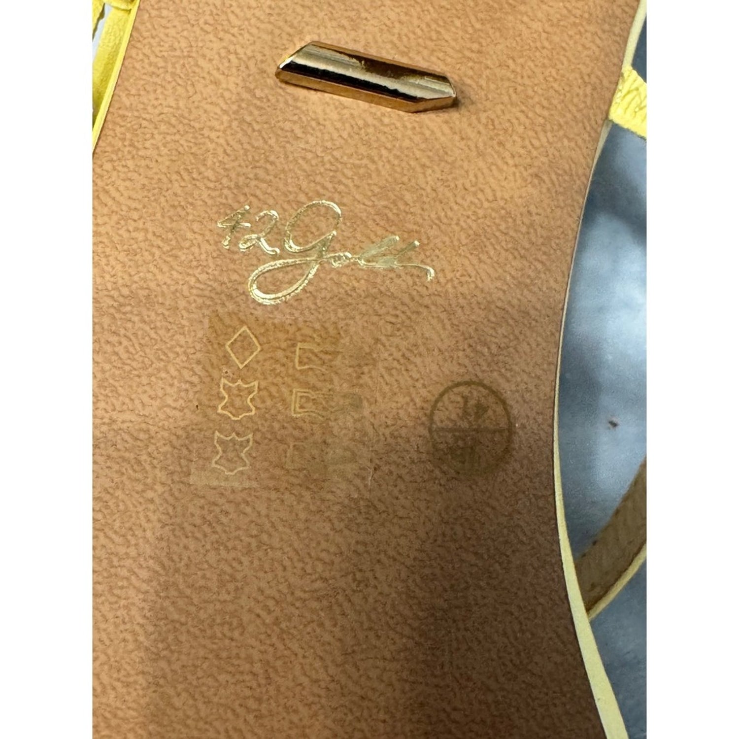 Details: Cheerful and chic, these strappy yellow sandals feature cut-out leather flower appliqués with gold-tone accents, a back-zip closure, and a modern square toe.