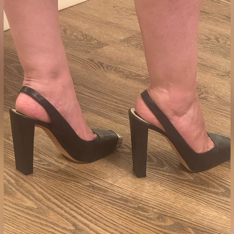 Features: Slingback, Leather Upper, Block Heel, Silver Toe Cap, Elegant