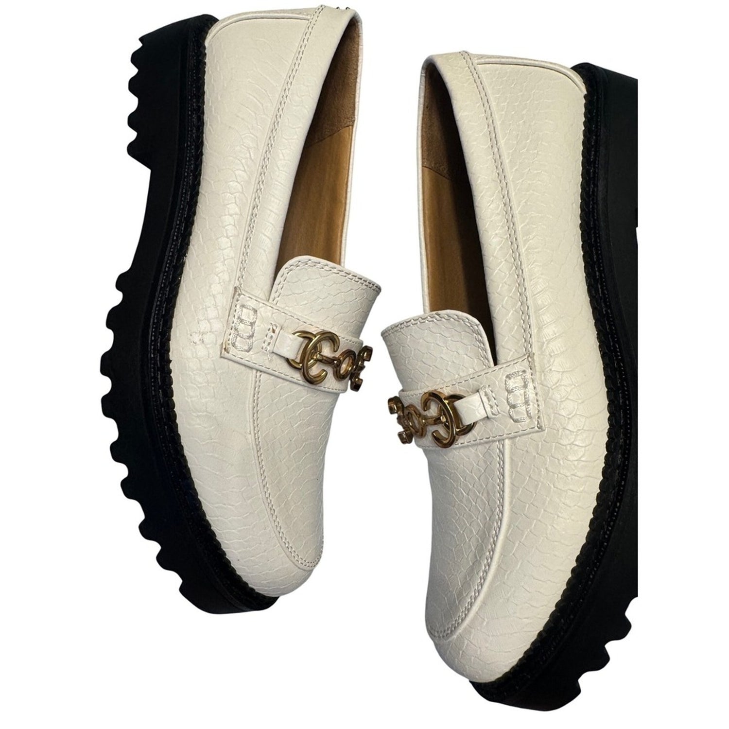 Keywords: Circus by Sam Edelman, loafers, womens shoes, white loafers, lug sole loafers, gold hardware, faux leather, casual shoes, slip on shoes, fashion loafers, comfortable loafers, designer loafers