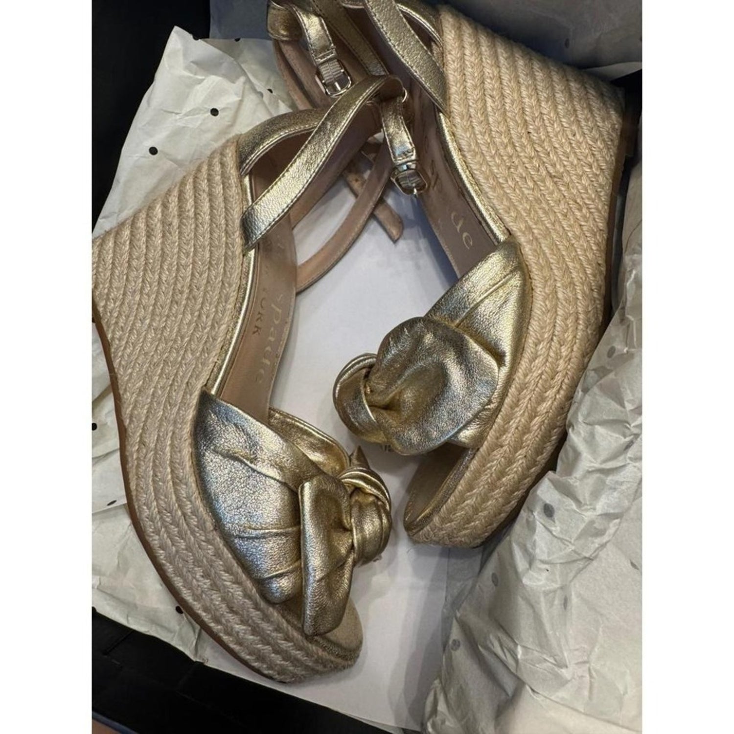 Keywords: Kate Spade, Wedge Sandals, Espadrille, Gold Sandals, Metallic Leather, Bow Detail, Ankle Strap, Designer Shoes, Summer Sandals, Elegant Wedges, Tianna, Platform Wedges, Pale Gold