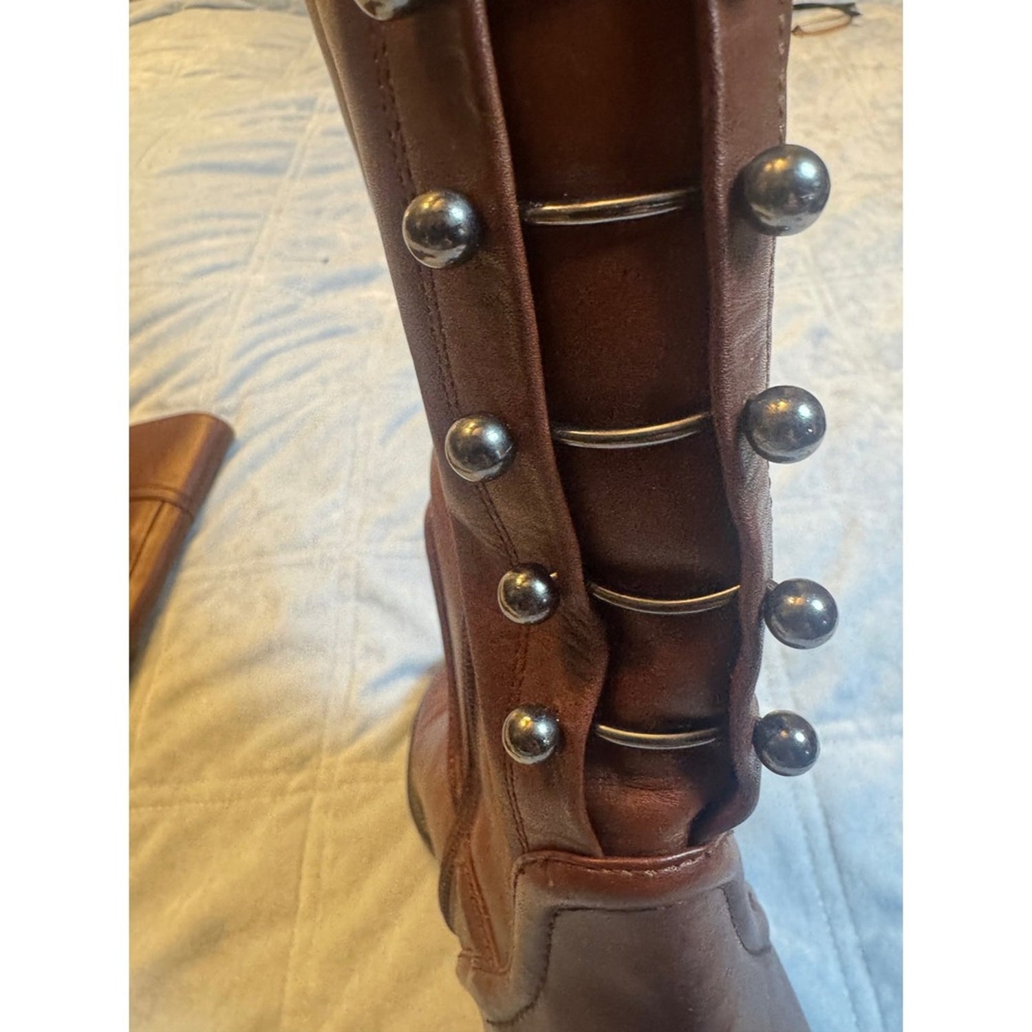 These Bini tall brown leather boots bring equestrian chic with a punk edge — real leather, rich chestnut brown, and a killer row of silver ball + bar details climbing the shaft.