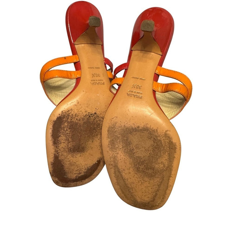 Keywords: Prada, Sandals, Heeled Sandals, Thong Sandals, Orange Sandals, Red Sandals, Leather Sandals, Designer Sandals, Size 38.5, Kitten Heel, Fabric Sandals, Italian Shoes, Luxury Shoes