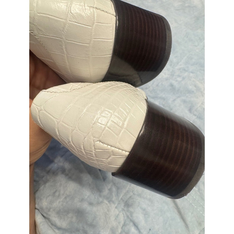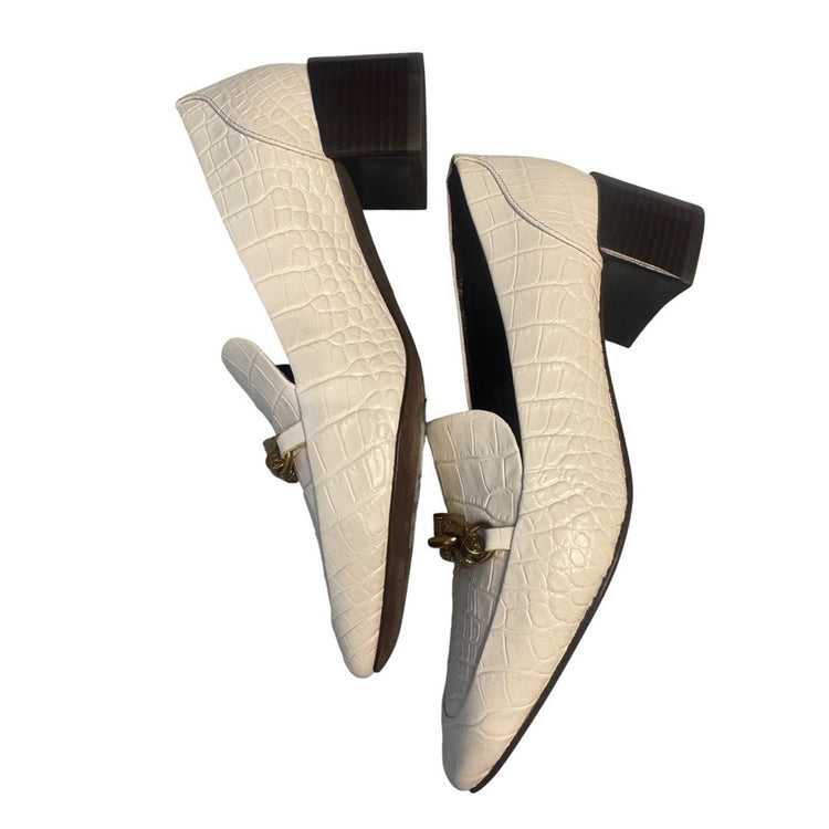 Keywords: Tory Burch, white loafers, leather shoes, crocodile embossed, block heel, pointed toe, gold chain, womens shoes, designer loafers, casual shoes, slip on shoes, loafers, heels, dress shoes