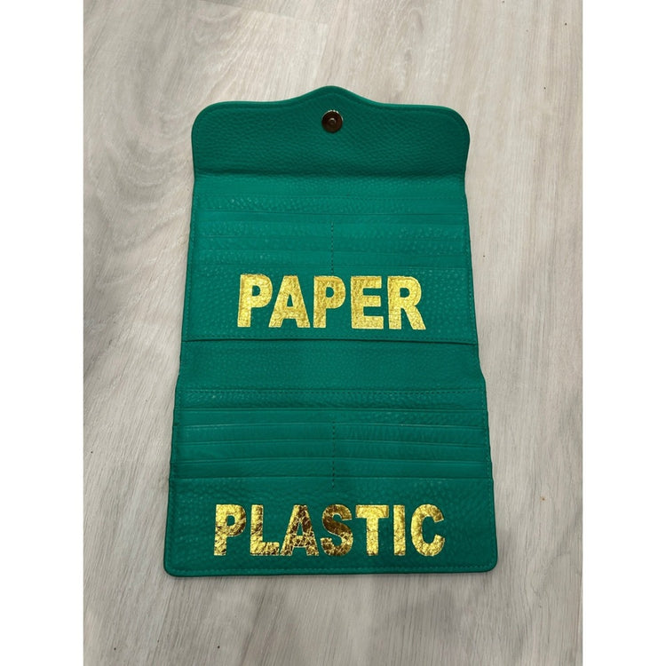 Keywords: leopard print, clutch, wallet, card holder, green interior, designer, fashion accessory, snap closure, statement piece, animal print