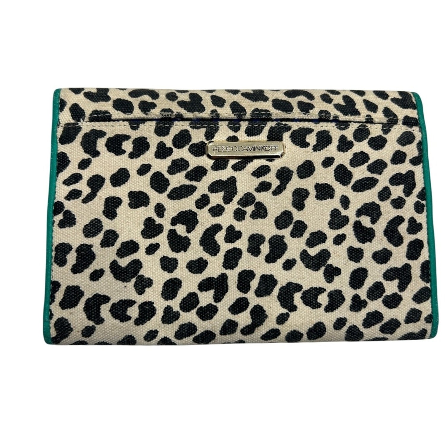 Rebecca Minkoff leopard print clutch wallet with a vibrant green interior. This versatile accessory offers multiple card slots and a secure snap closure. The exterior showcases a chic leopard pattern, complemented by a striking solid green lining and trim. A subtle metal logo plate adds a touch of brand sophistication.