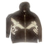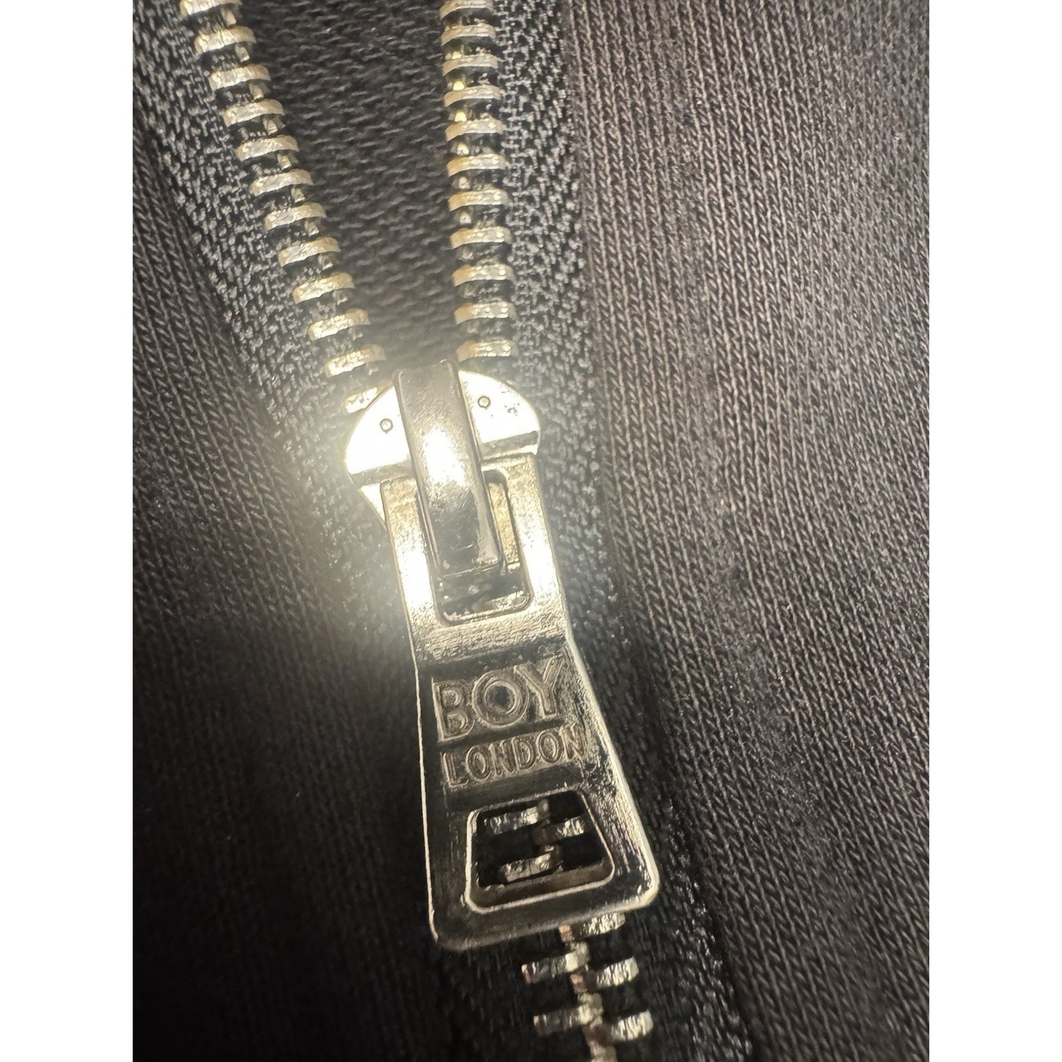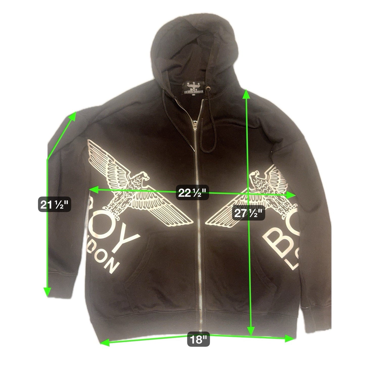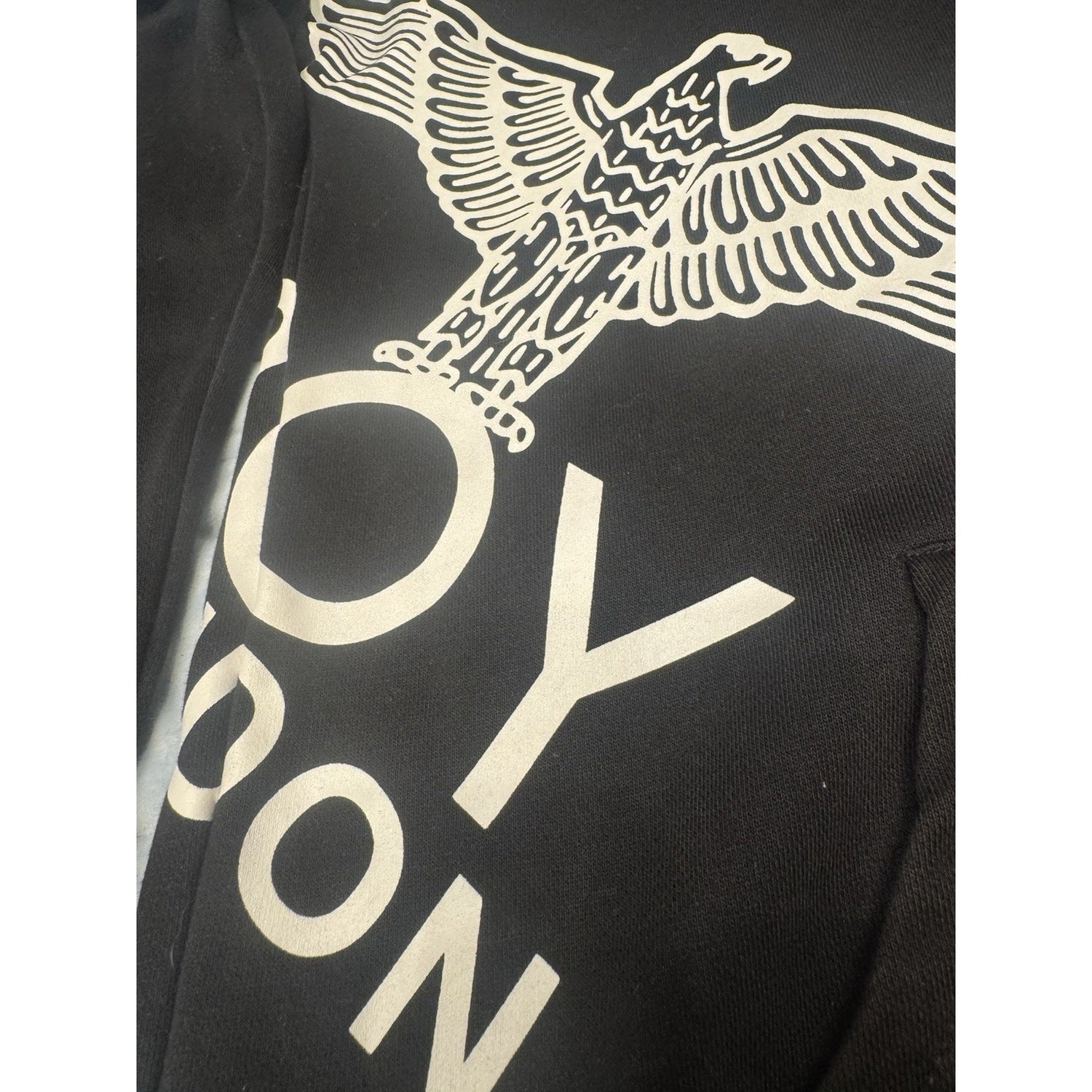 Step into bold London streetwear style with this authentic BOY London zip-up hoodie. Designed in jet black with the brand’s signature double eagle graphic across the front, this piece makes a serious statement. Full-zip front with branded BOY London zipper, drawstring hood, and kangaroo pockets complete the look.