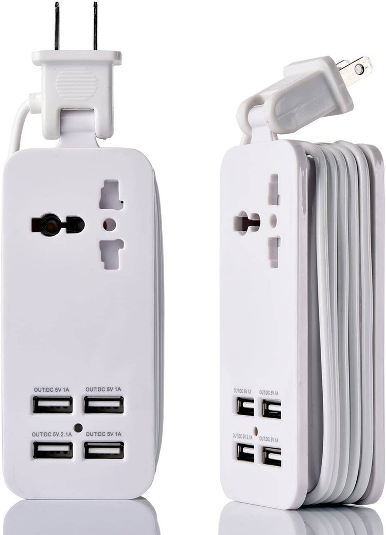 This is a handy travel charger, it has 4 USB ports and additional international adapters. Comes with a 5ft cord that rolls up nicely to save space. 5 fun colors.
