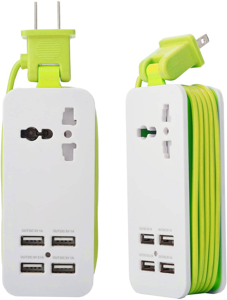 This is a handy travel charger, it has 4 USB ports and additional international adapters. Comes with a 5ft cord that rolls up nicely to save space. 5 fun colors.