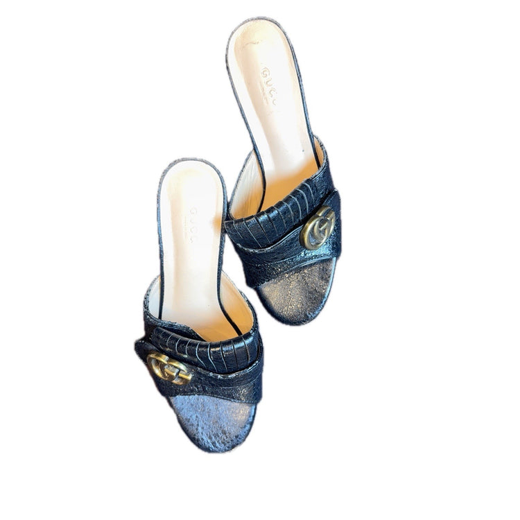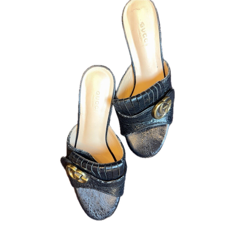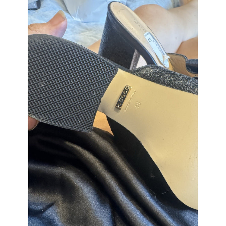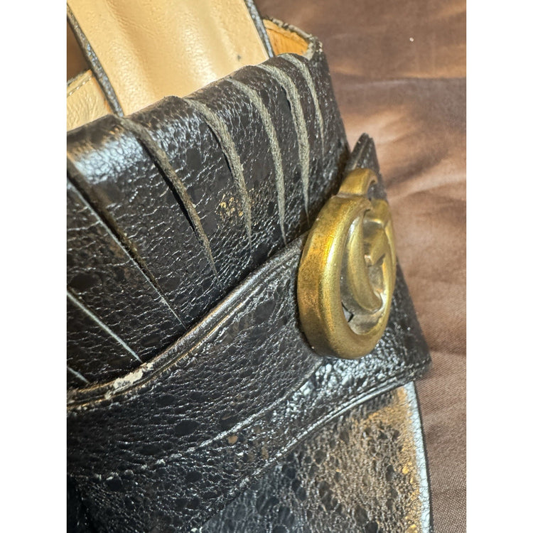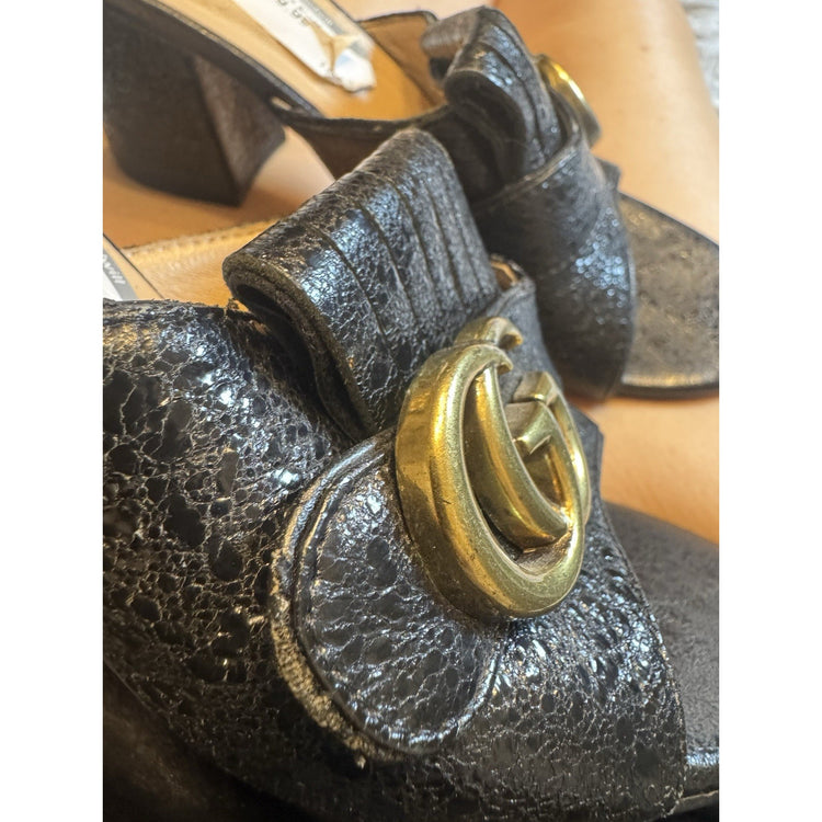 Gucci Marmont Black Crackle Leather GG Block Heel Mules Size 40 (US 10)