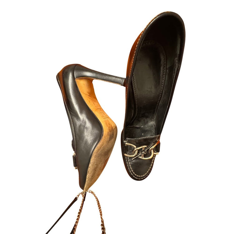Authentic Prada loafer-inspired pumps in black leather with gold-tone chain link hardware. A chic blend of classic loafer styling and stiletto elegance.