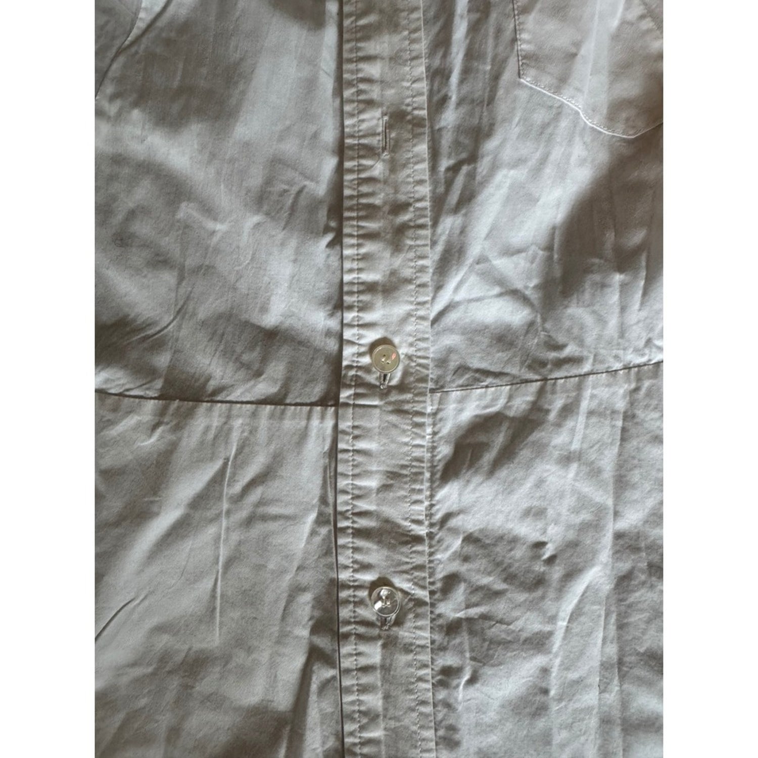Keywords: ACNE shirt dress, white band collar shirt, button up tunic top, designer shirt dress, Acne Studios top, oversized shirt dress, minimalist fashion, womens tunic, band collar blouse, raw hem pocket, curved hem shirt, casual chic, versatile top