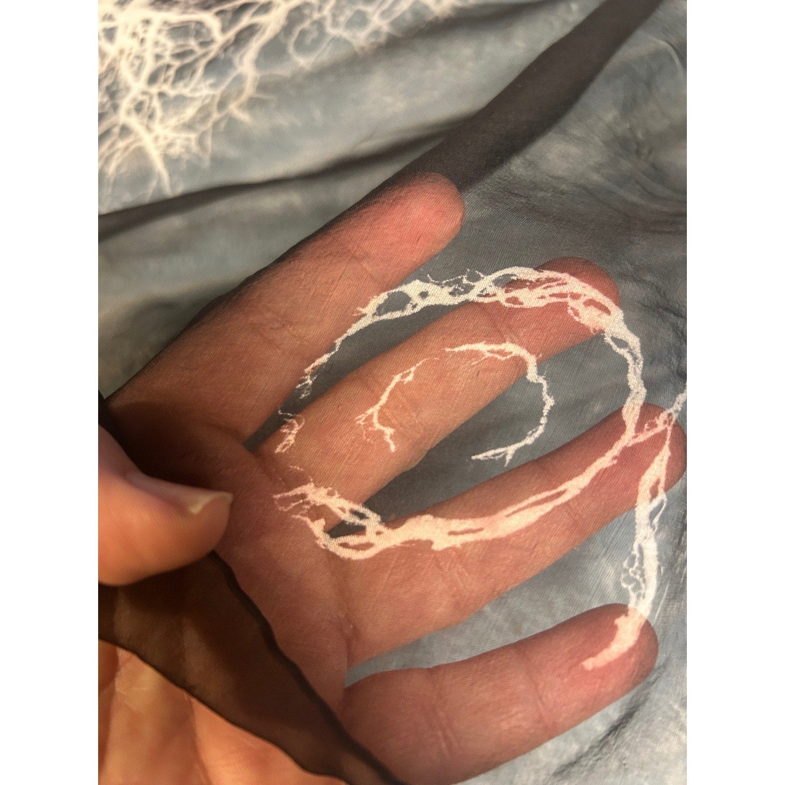 Alexander McQueen Sheer black and white scarf showcases an intricate, ethereal tree branch or root system print that creates a striking gothic aesthetic. Crafted from a lightweight, translucent chiffon-like fabric, this versatile accessory offers a soft drape and a delicate hand feel, perfect for layering over evening wear or adding a dark academic touch to daily outfits.