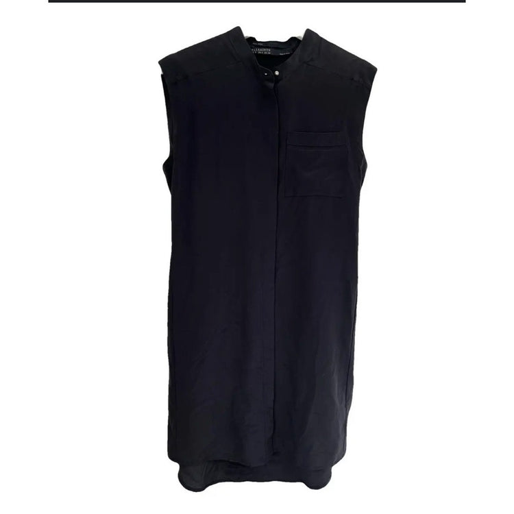 Keywords: AllSaints dress, silk dress, sleeveless dress, button down dress, black dress, womens dress, shirt dress, casual dress, mini dress, designer dress, AllSaints shirt dress, silk mini dress