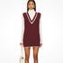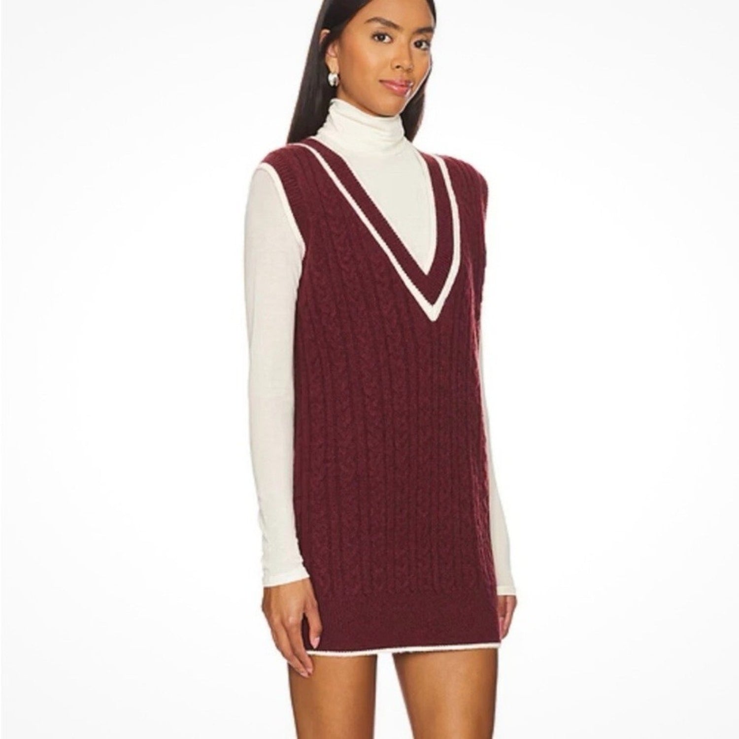 Sleeveless, burgundy cable knit dress is made from a cozy blend of 45% Acrylic, 30% Polyester, and 25% Nylon. Featuring a classic V-neck and contrast ivory details, it offers a sophisticated sheath silhouette perfect for layering or wearing solo. Designed with a convenient pull-on closure, this mini masterpiece is easy to care for with a simple hand wash in cold water.