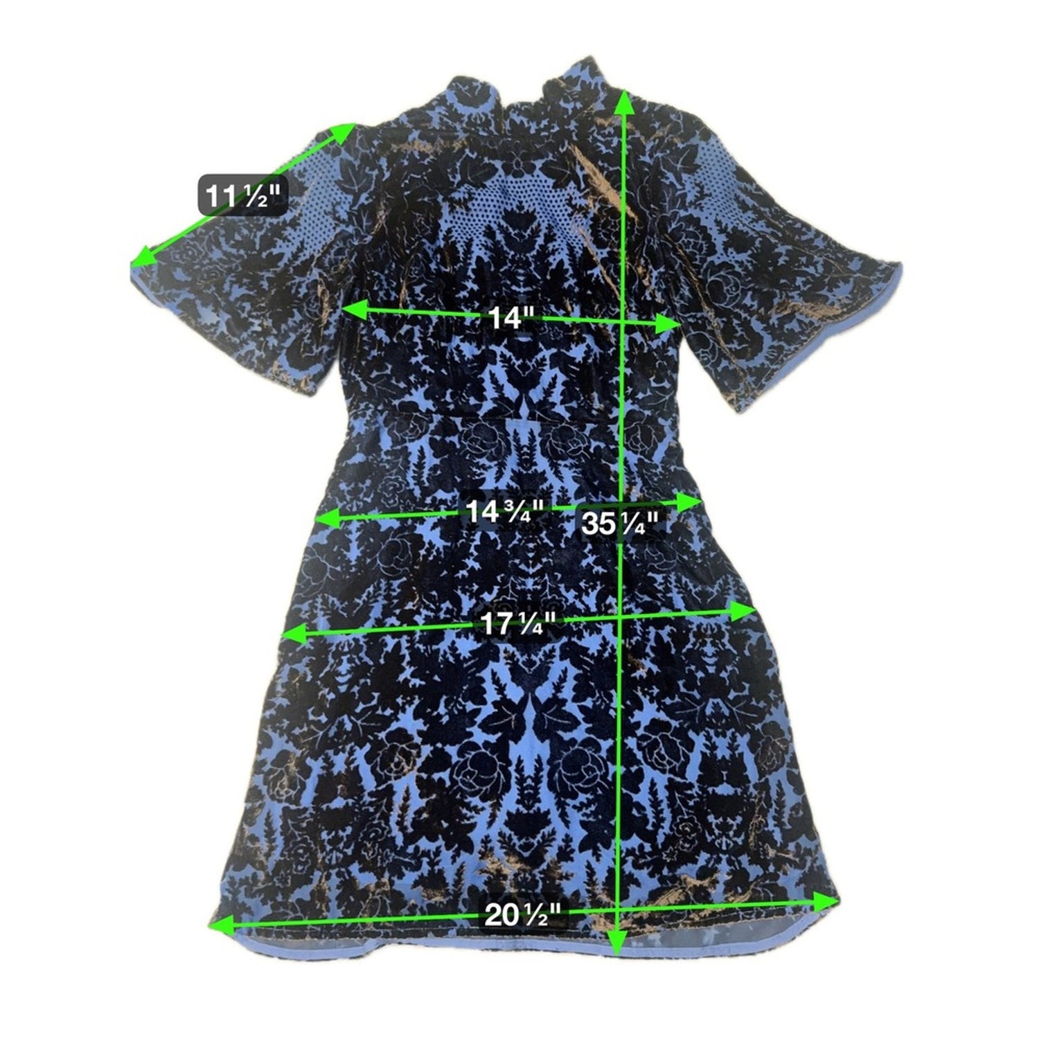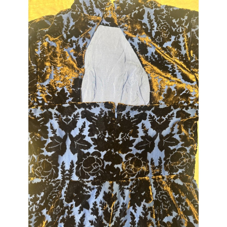 Anthropologie "BLK MOTIF" velvet burnout dress with a mock neck and bell sleeves. Features a striking black floral burnout pattern on a light blue base. The dress has a flattering fit and flare silhouette with a concealed back zipper closure and a cutout detail at the back neck.