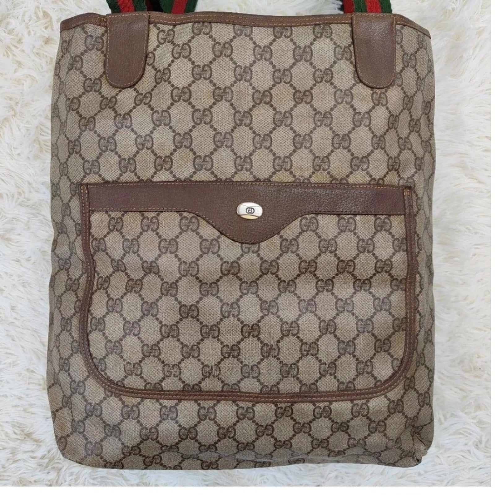 Keywords: Gucci tote bag, Vintage Gucci, GG monogram, Designer handbag, Canvas tote, Red green stripe, Shoulder bag, Everyday bag, Luxury handbag, Authentic Gucci, Iconic bag,
