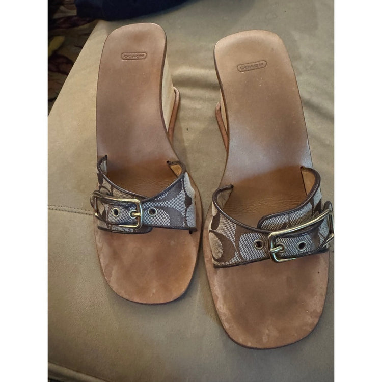 Coach Monogram Wedge Sandals 2000s Y2K Brown Logo Buckle Heels Size 7.5