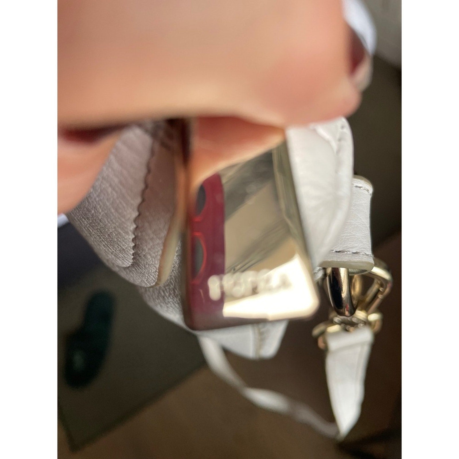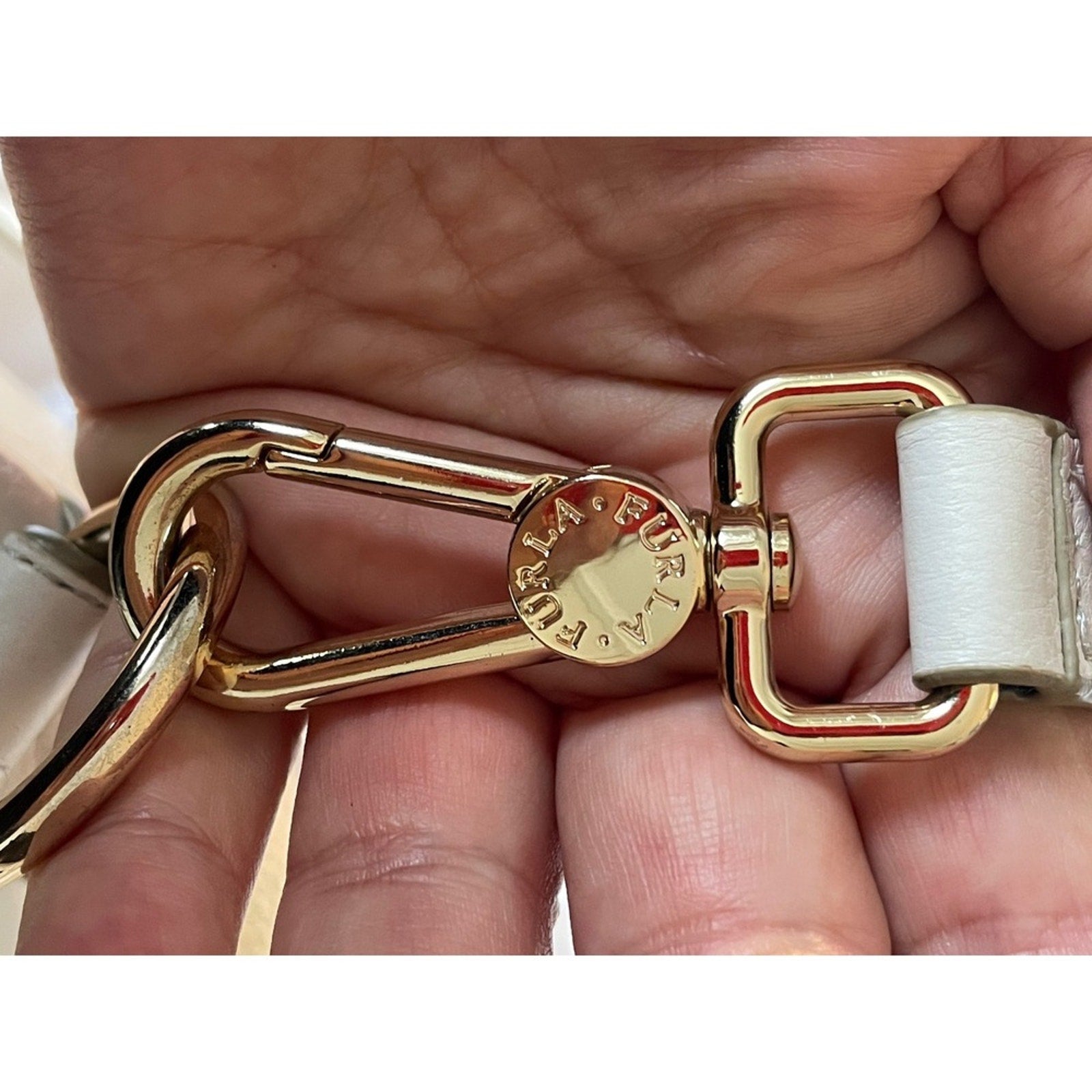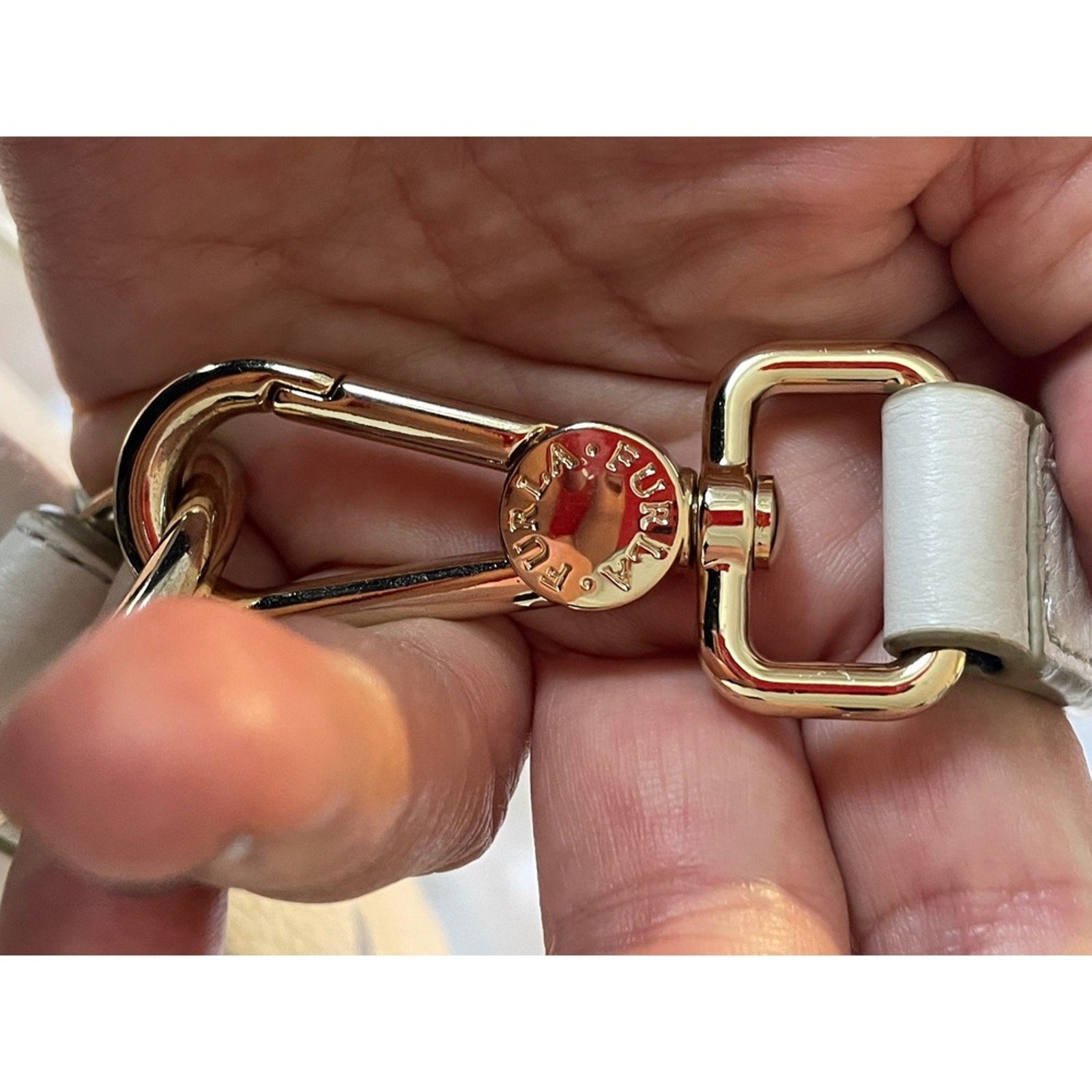 Keywords: Furla bag, leather handbag, crossbody purse, shoulder bag, flap bag, zip closure, gold hardware, designer bag, neutral bag, everyday bag, minimalist, chic, lightweight