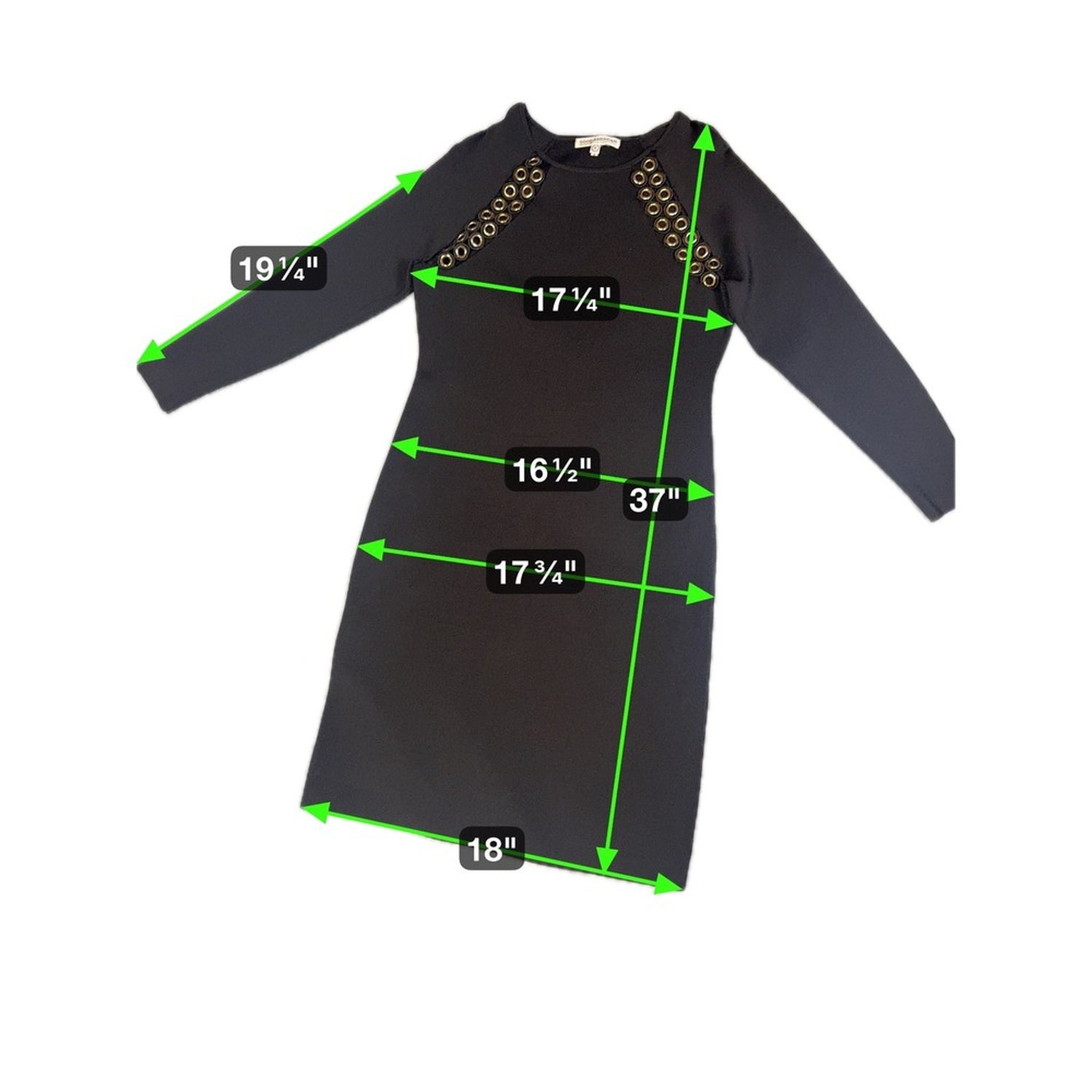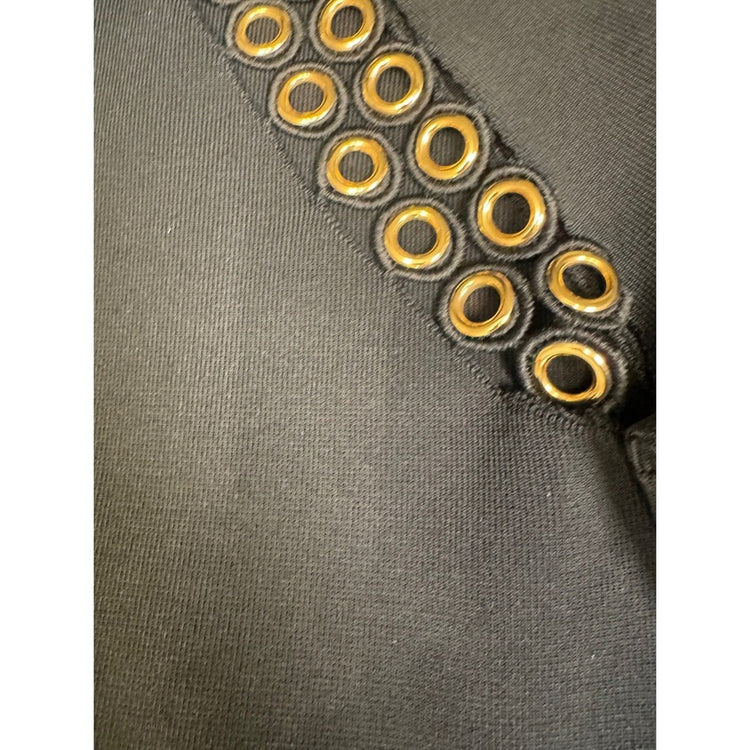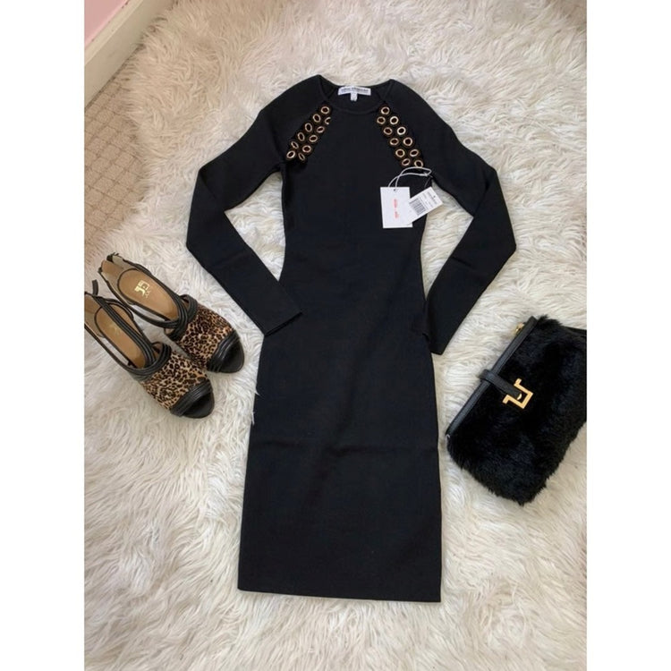 Glimmering gold grommets accent the shoulders, lending an edgy touch to the classic bodycon silhouette. This dress features a flattering fit that hugs your curves in all the right places, while the long sleeves offer a touch of warmth. The refined ribbed texture adds subtle depth and visual interest, elevating its overall