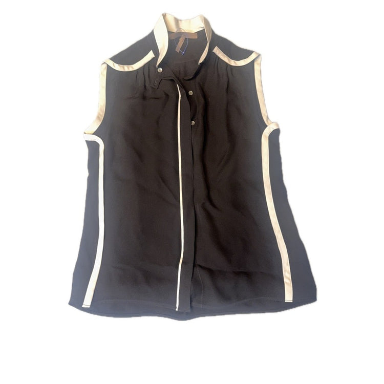 A sleeveless black silk blouse by Halston Heritage. This elegant top features contrasting cream trim along the neckline, armholes, and a central placket. It includes a button-front closure and a stand-up collar detail.