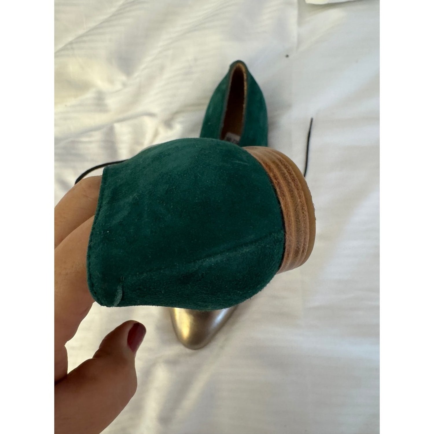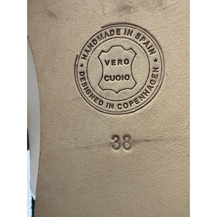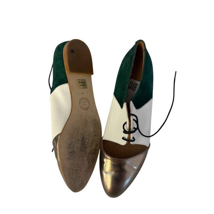 Designed in Copenhagen, made in Spain — the kind of shoe that gets compliments from strangers and art teachers. Metallic gold toe, green suede heel, white leather body. Absolute statement pair.