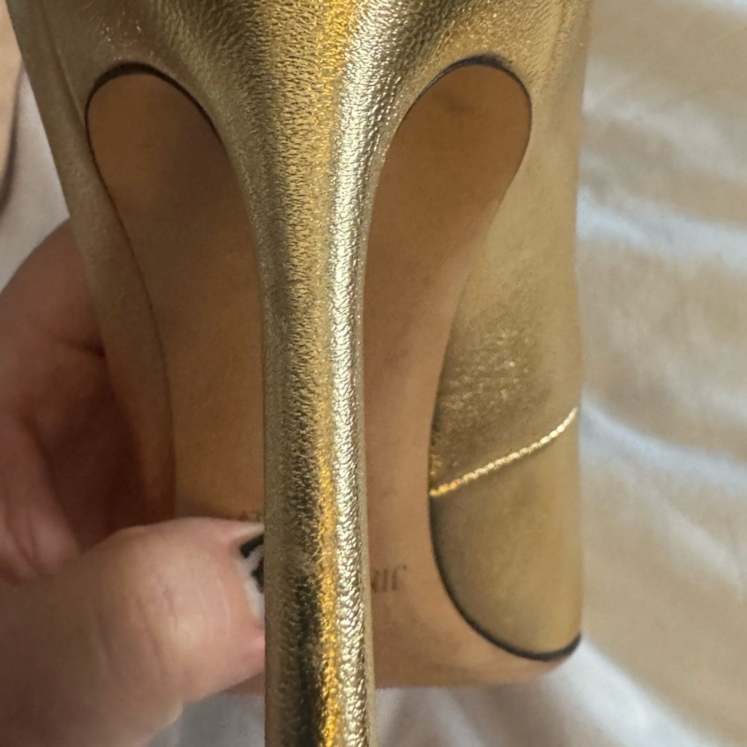 These exquisite Jimmy Choo boots showcase a captivating blend of black stretch fabric and glossy metallic gold accents. The ankle-height design is elevated by a slim stiletto heel, creating a sophisticated and modern silhouette. Perfect for making a bold statement, these boots seamlessly combine elegance with contemporary flair.