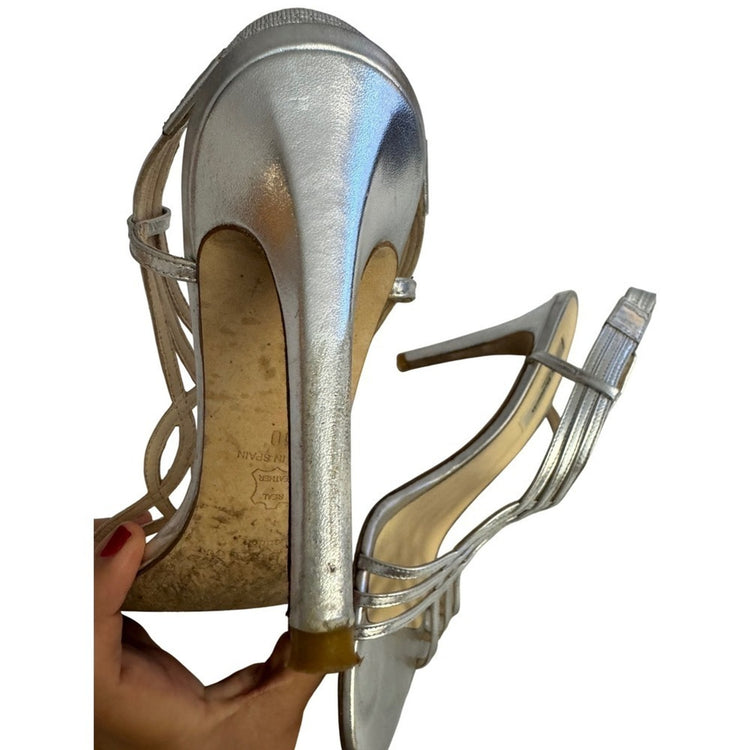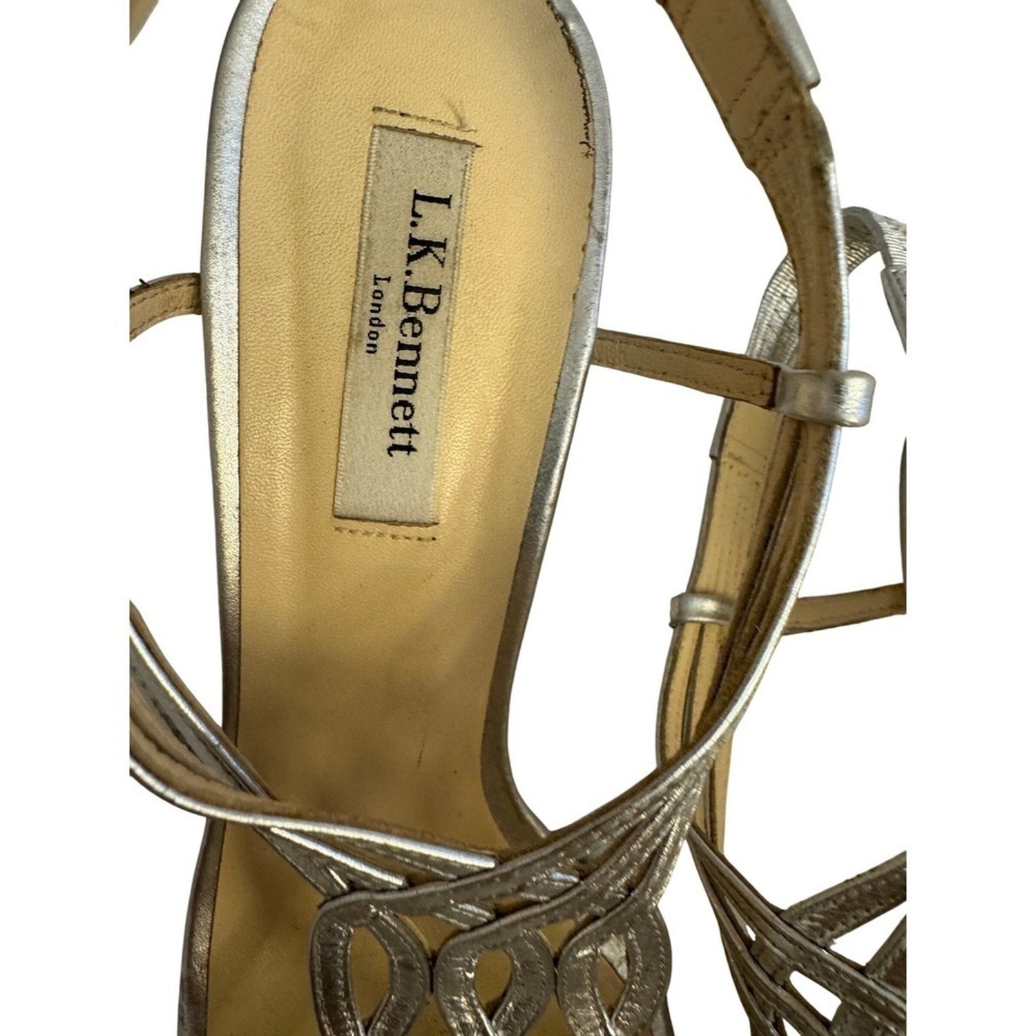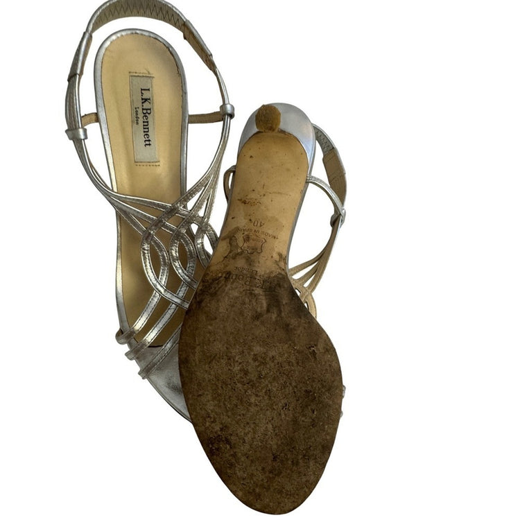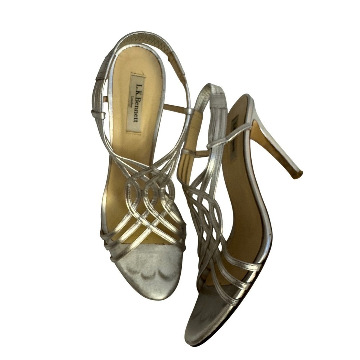 Keywords: L.K. Bennett, Silver Heels, Strappy Sandals, Women's Shoes, Size 40, Designer Heels, Evening Shoes, Party Heels, Special Occasion, Made in Spain, Leather Sandals, Ankle Strap, Formal Wear, Metallic Heels