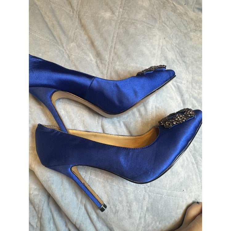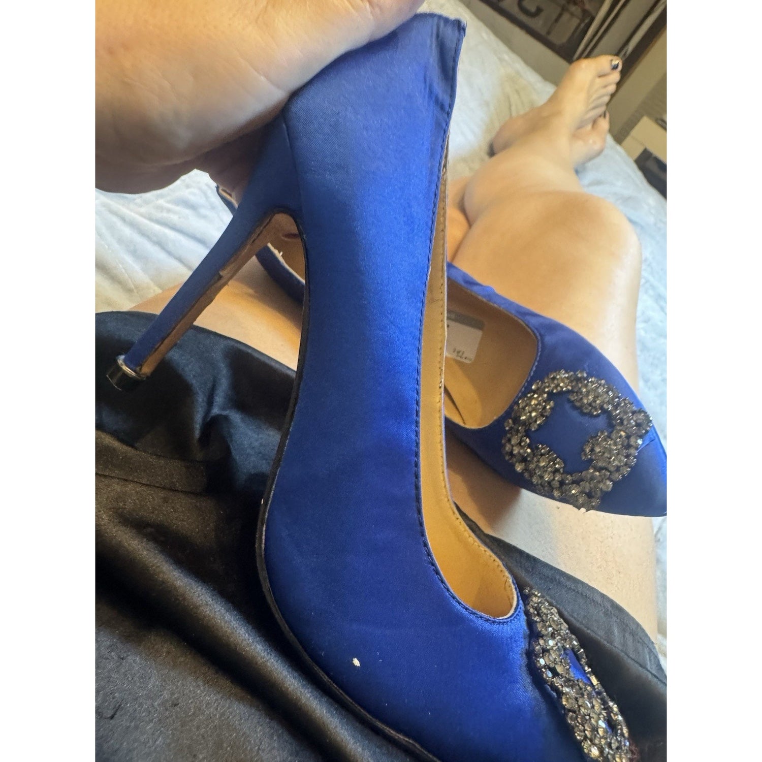 Step into iconic style with these authentic Manolo Blahnik Hangisi pumps, made famous by Sex and the City. Crafted in rich royal blue satin and adorned with the signature crystal buckle, these heels are a timeless statement for weddings, galas, or luxe nights out.