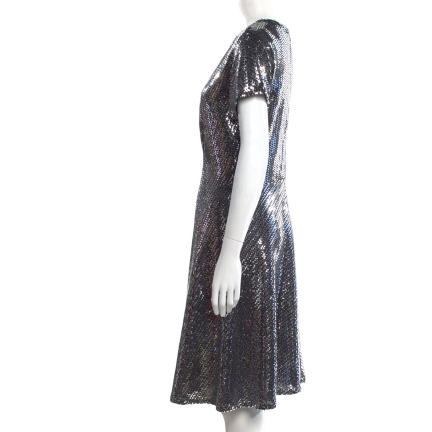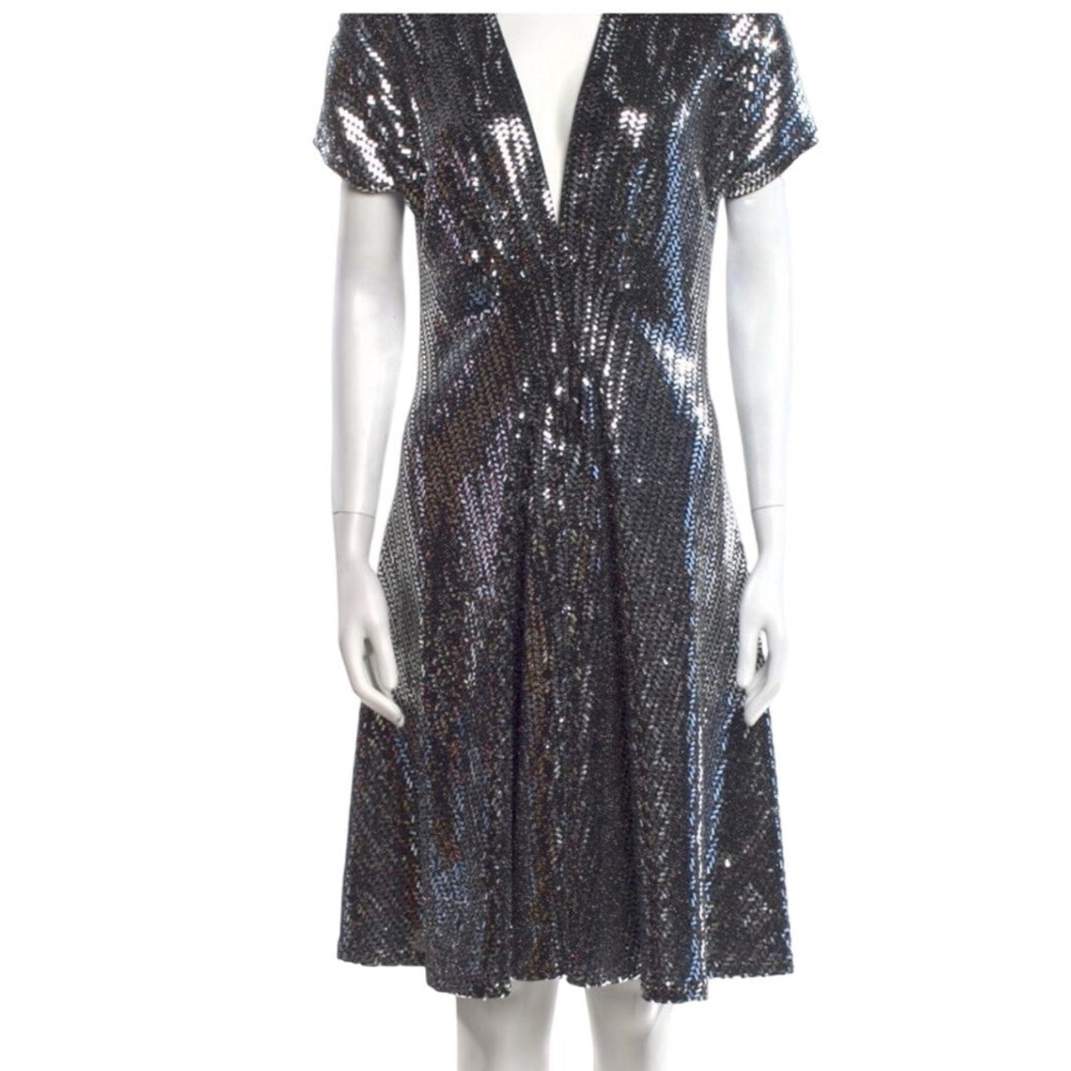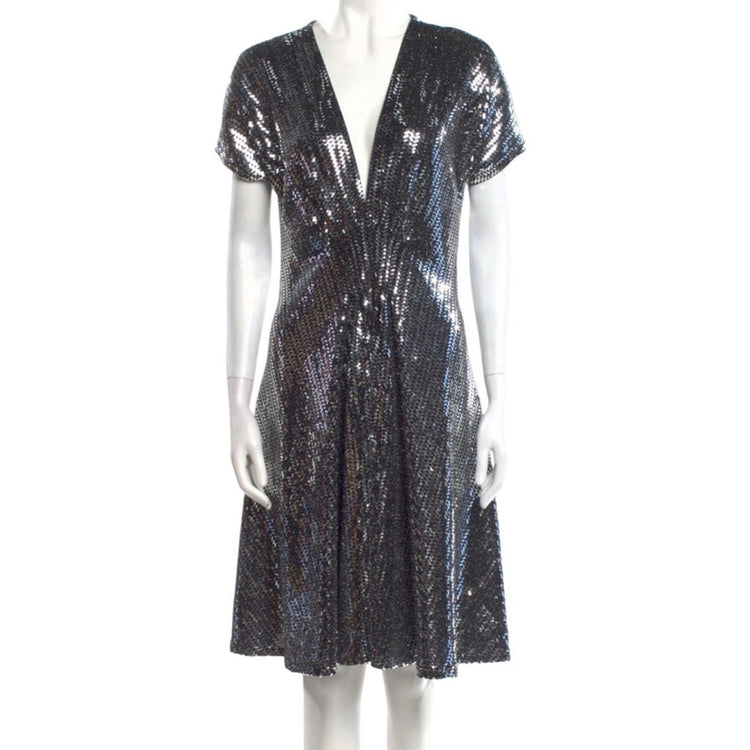 Keywords: Naeem Khan dress, NK32 dress, sequin dress, knee length dress, short sleeve dress, V neck dress, designer dress, party dress, evening dress, glamorous dress, sparkle dress, metallic dress, formal dress, special occasion dress, size L dress