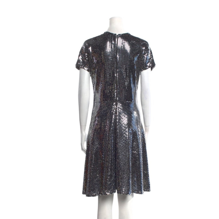 Turn heads in this dazzling Naeem Khan silver sequin dress — cut in a timeless fit-and-flare silhouette that flatters every shape. Covered in light-reflecting sequins from neckline to hem, this piece moves beautifully and catches the light with every step. Fully lined with a hidden back zip.
