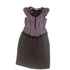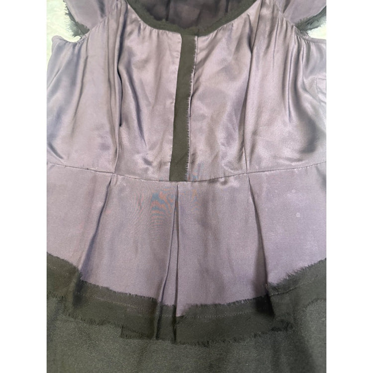 . A demure cap sleeve and gentle empire waist flatter the figure, while the refined silhouette adds a touch of classic charm. The interplay of deep black and muted purple creates visual interest, and the artfully frayed trim adds an intriguing, contemporary edge.
