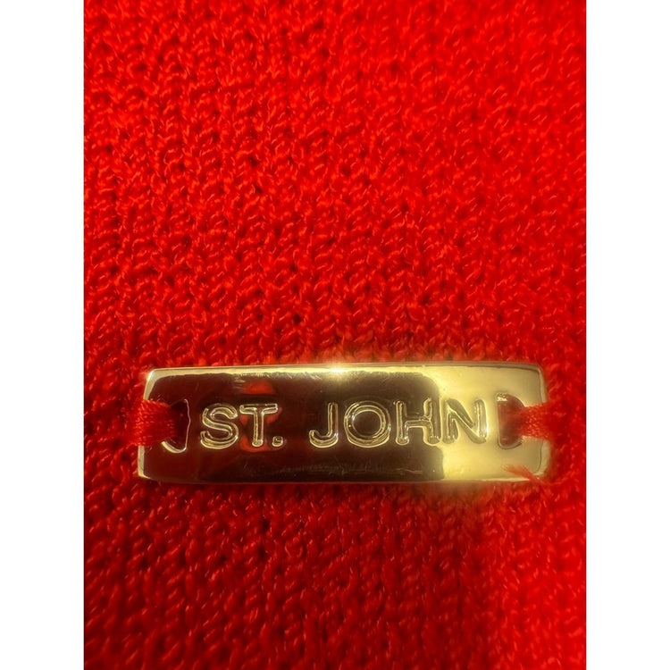 A sophisticated sleeveless knit top from St. John Collection, showcasing a vibrant red hue complemented by elegant black trim around the neckline and armholes. This garment features a timeless design with a subtly textured knit and a tailored silhouette. The refined construction is evident in the clean lines and the overall quality of the piece. It is finished with a small, understated metallic logo detail near the hem.