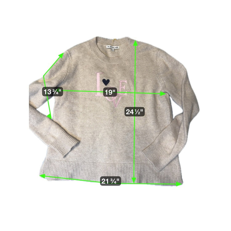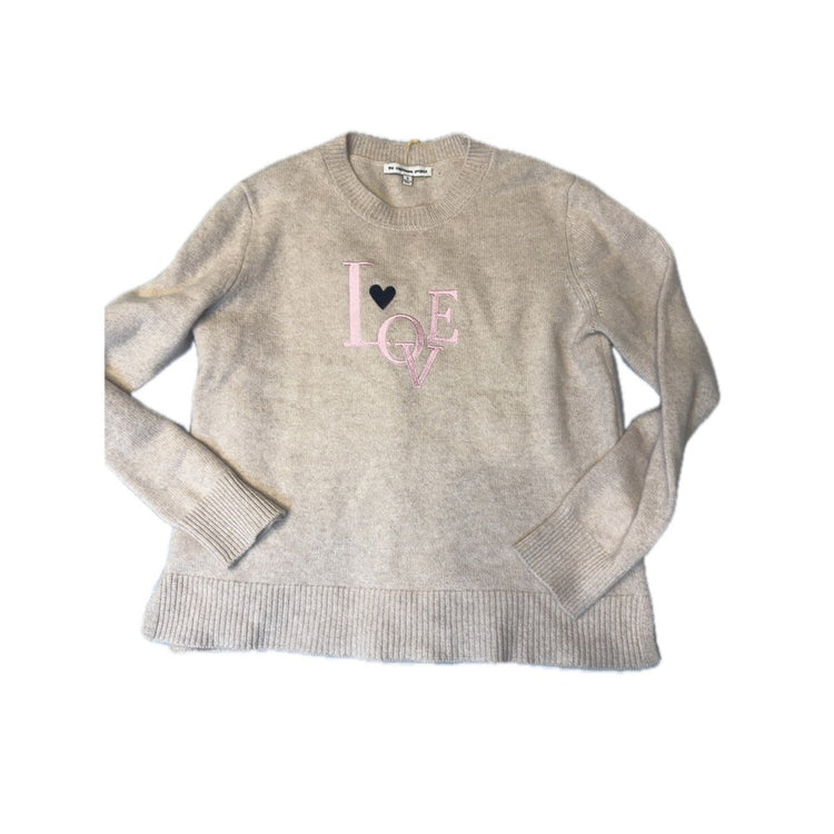 The Cashmere Project women's sweater in a soft tan hue. This crew neck pullover features a charming pink embroidered 'LOVE' graphic with a black heart detail. Ribbed cuffs, hem, and neckline add classic sweater styling.