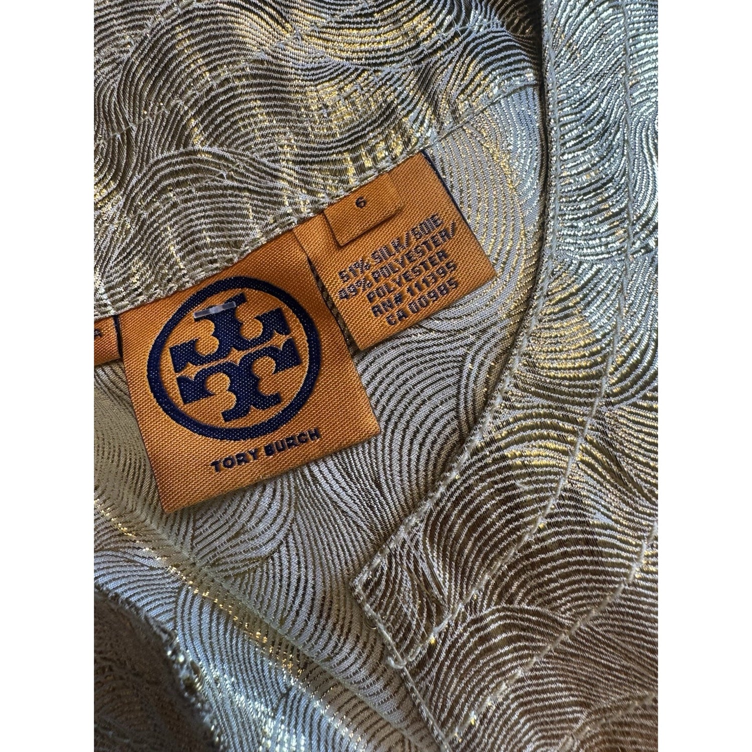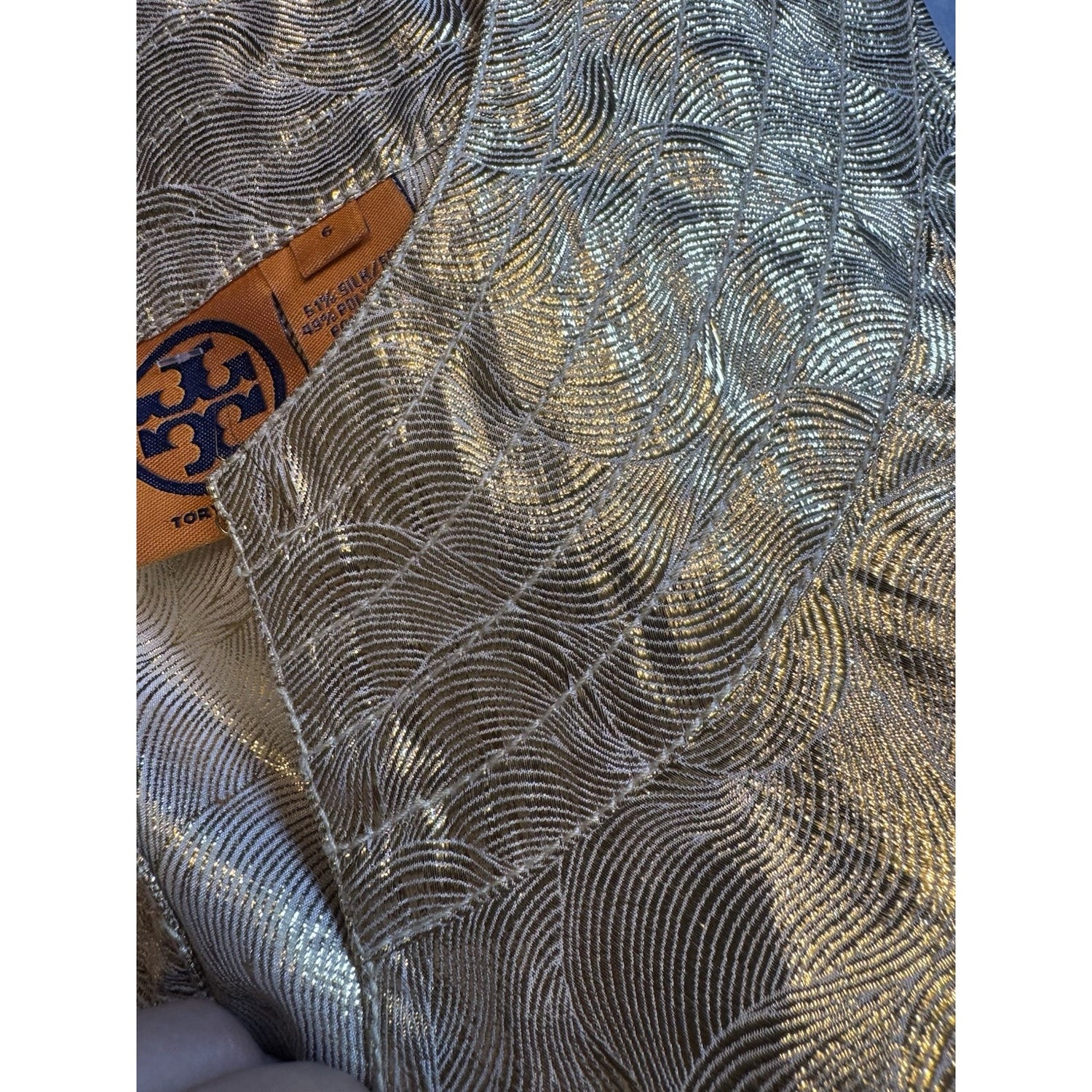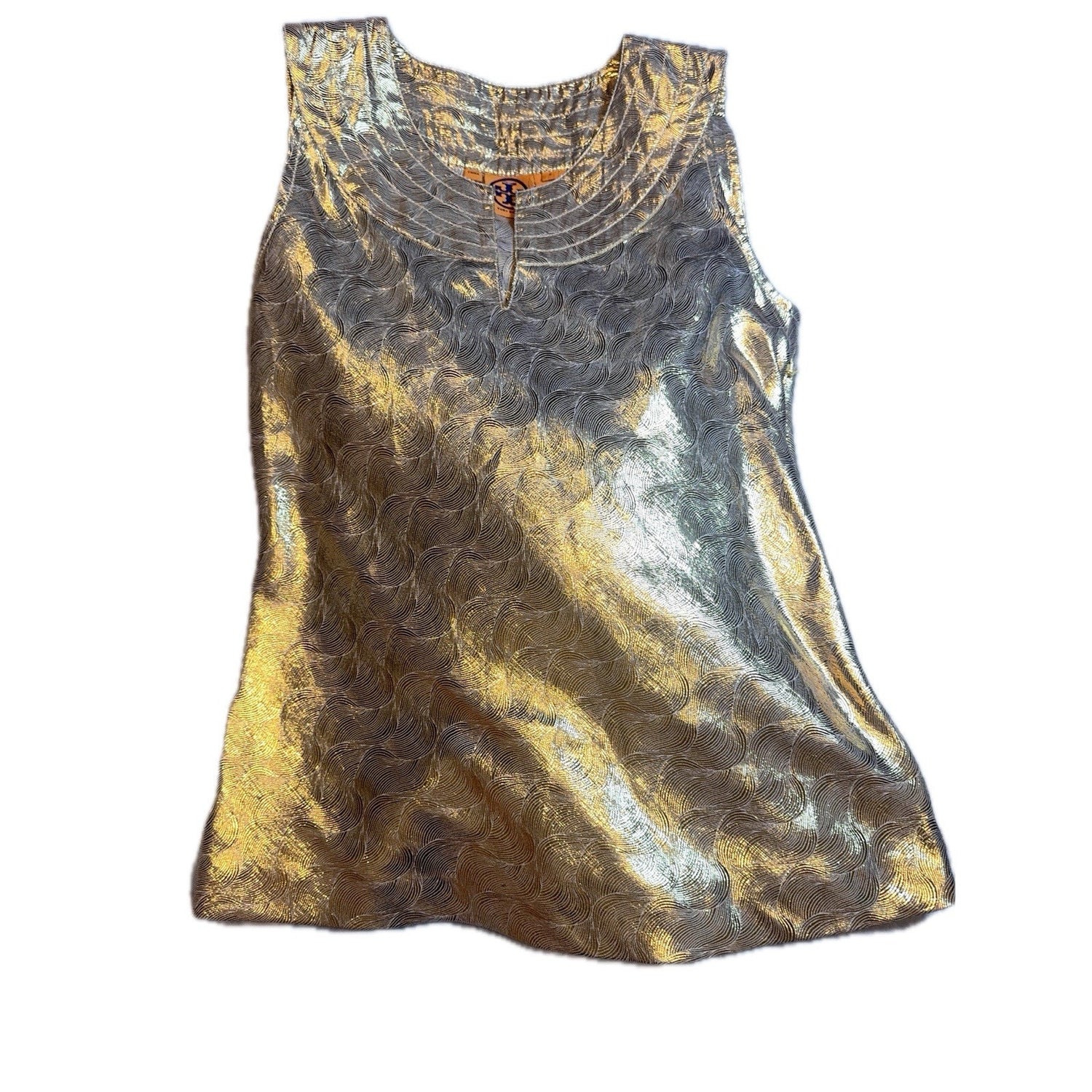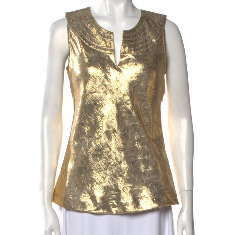 Turn heads in this stunning Tory Burch sleeveless metallic gold top. Crafted from a silk-blend fabric (51% silk, 49% polyester) with intricate woven swirl-texture detailing, this luxe blouse features: